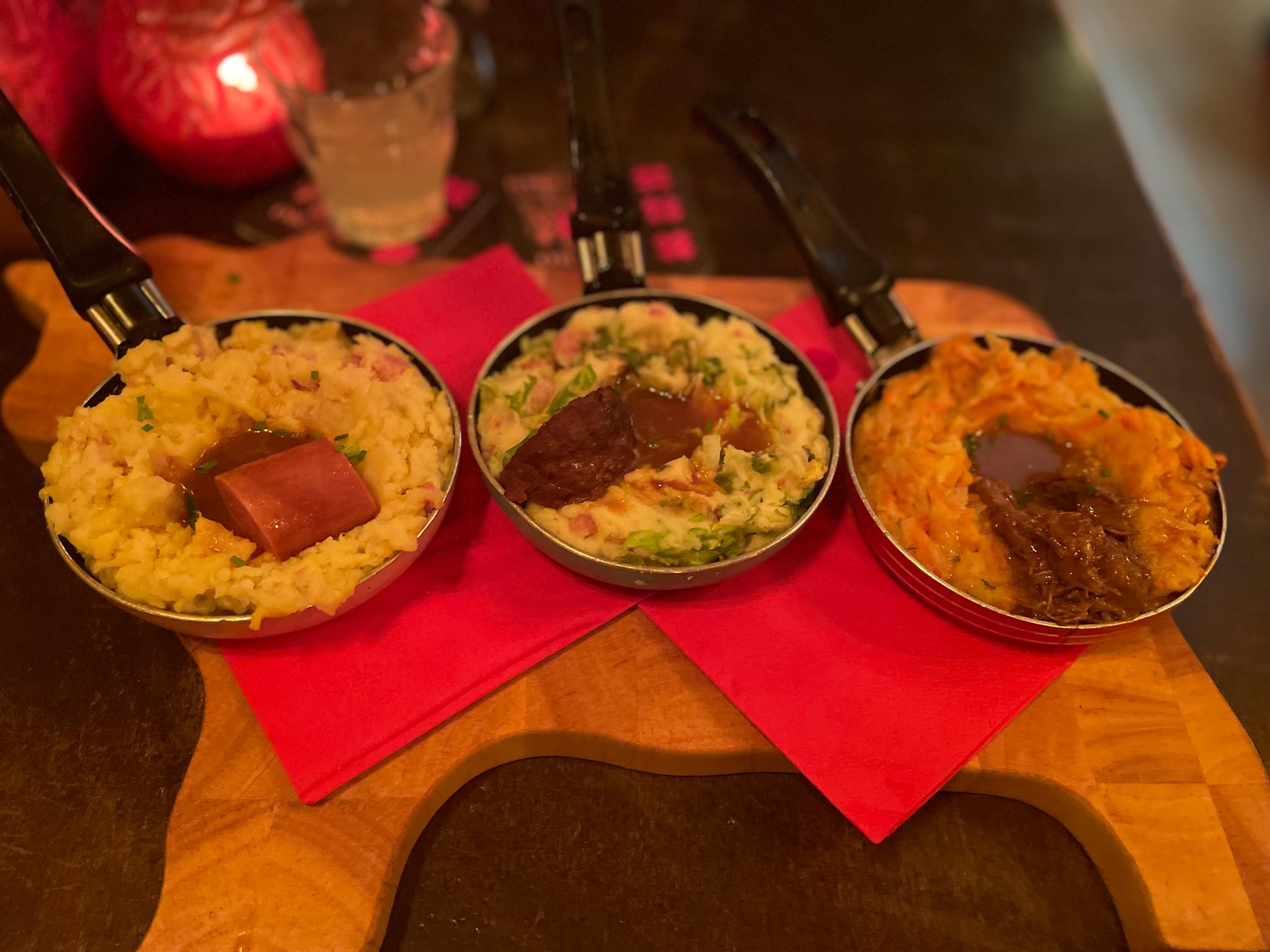 Stamppot Proeverij: three traditional Dutch stamppots in mini-pans with bacon, gravy, sausage and mom's stewed beef