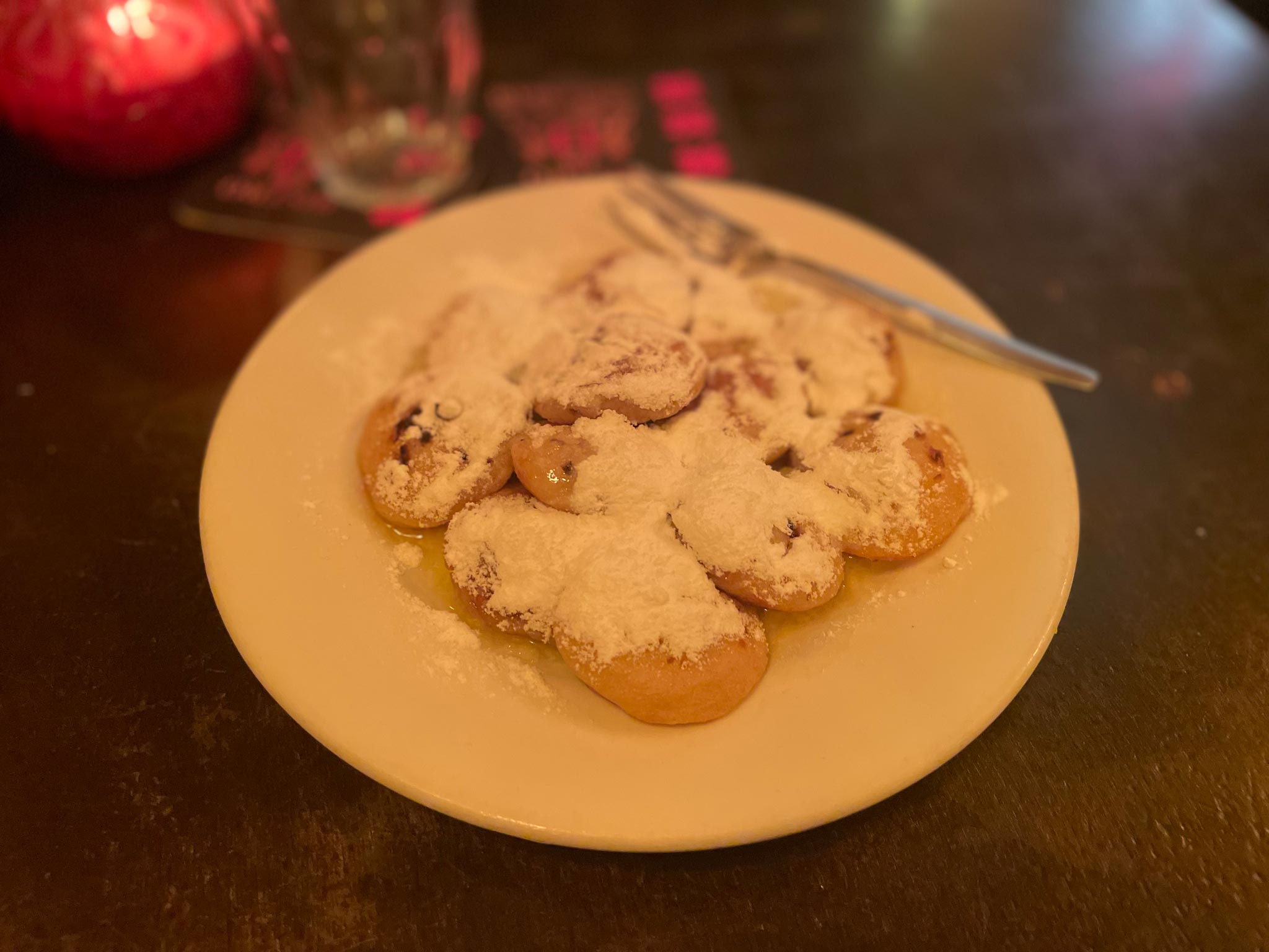 Poffertjes: tiny puff pancakes with powdered sugar and butter