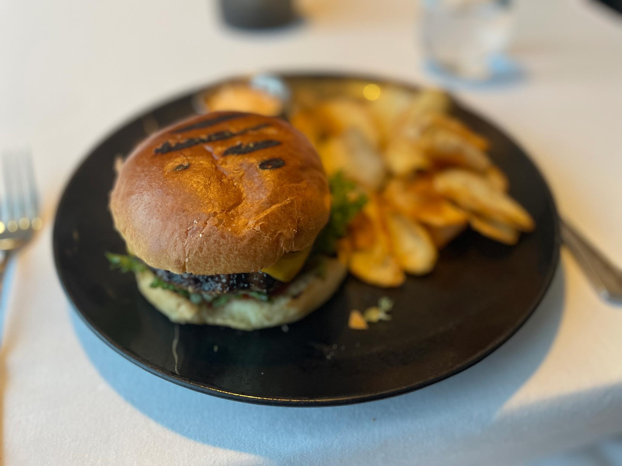The fries are thin cut but thicker than packet chips. They’re really nice and the chipotle mayo accompaniment hits the spot. I’ve ordered my burger medium, and it’s cooked perfectly. Still juicy, and a hint of smokiness from the grill on both the patty and the bun. The toppings are ordinary but work well. All in all, this is a solid but simple burger, but as with many Icelandic things, quite pricey for $37.