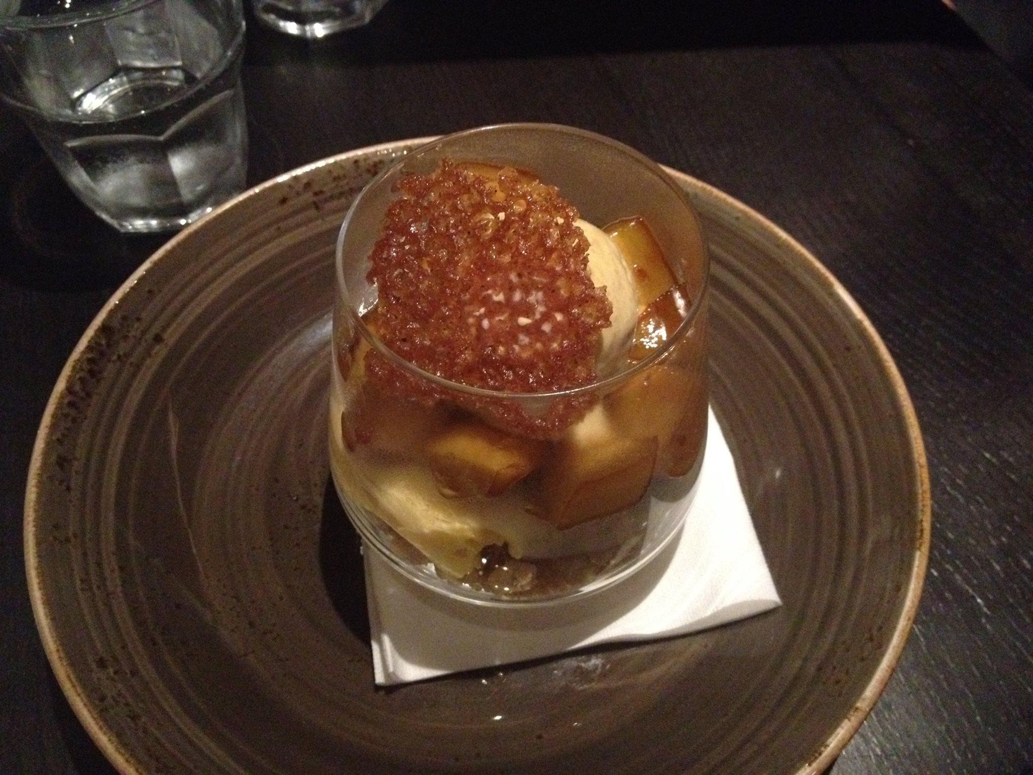 Full of great traditional flavours: spiced apple, brown sugar, dates and great textures and crunch that bring out the main fruit. A really nice and warming dessert that hits the soul.