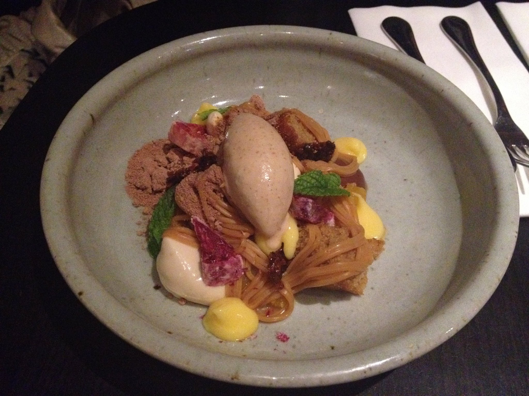 Decadent and rich, chocolate is well celebrated with a variety of interesting flavour combinations and textures: soft, moist, crunchy, silky, gooey. The chocolate spaghetti was a fun addition on the plate, but in reality it was just chocolate piping. A real work of art and a lot going on here. It was my favourite of the three desserts we ordered.