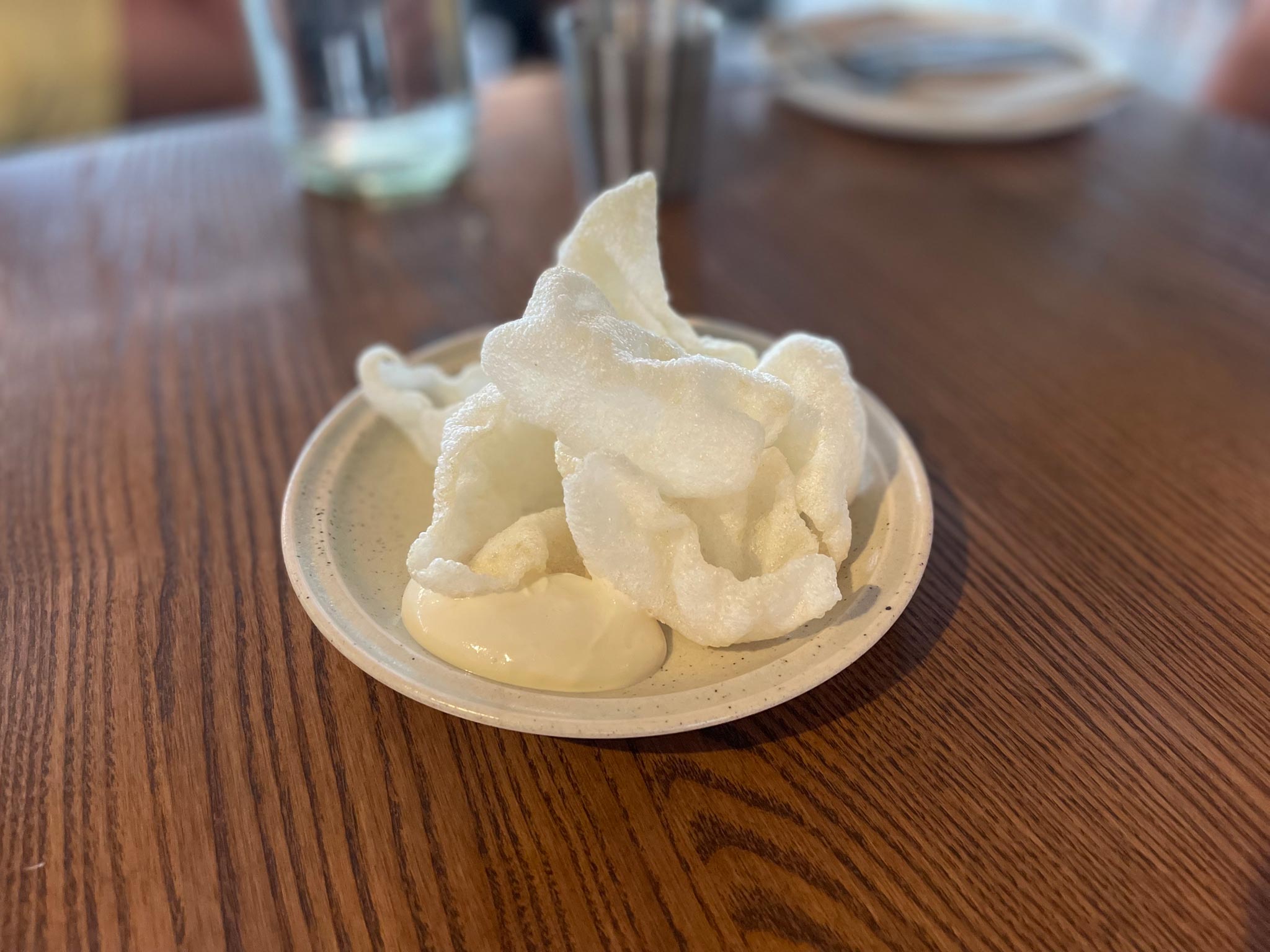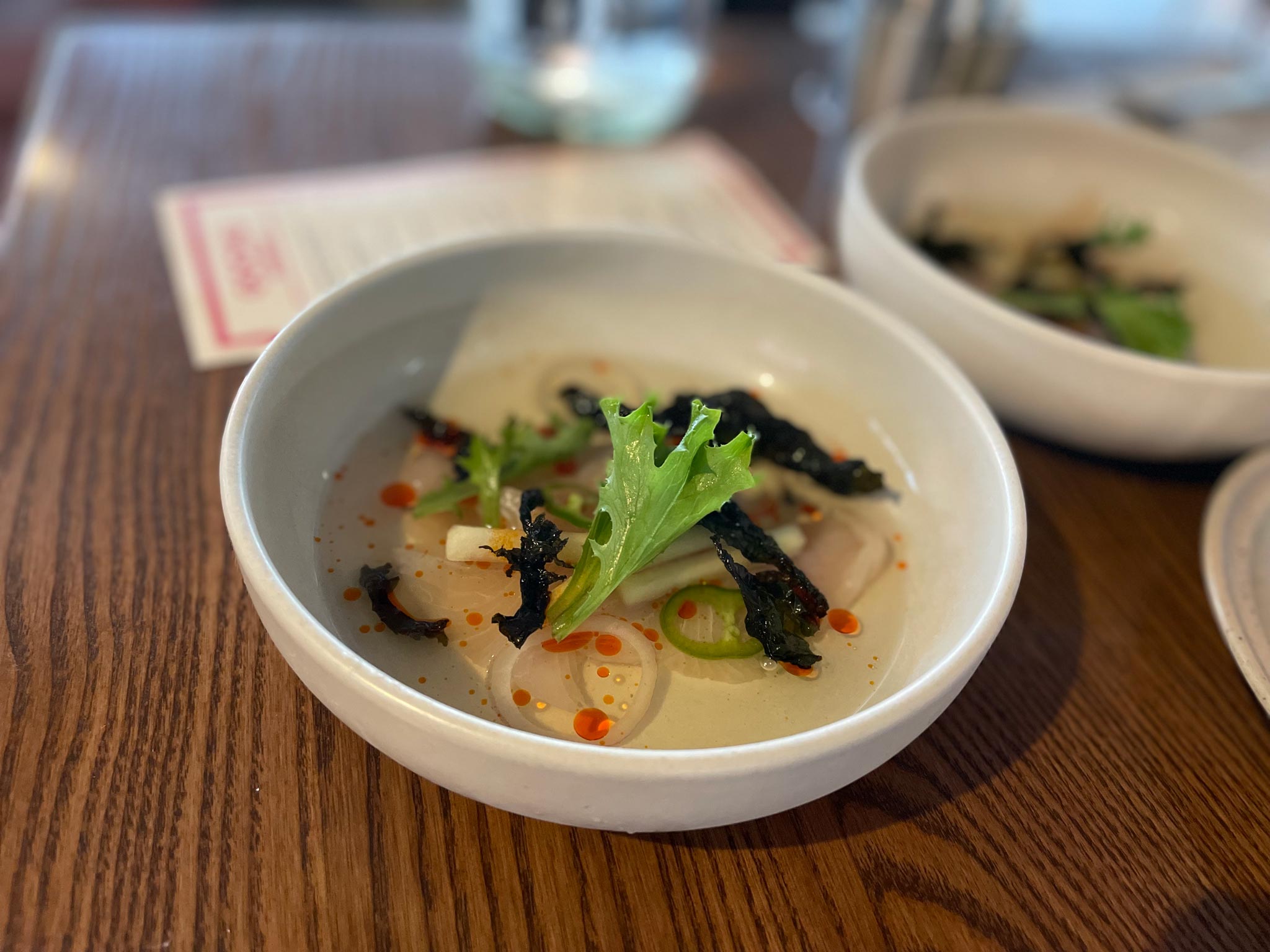 Cured kingfish, apple and anchovy consommé, chilli, shallots, crispy seaweed