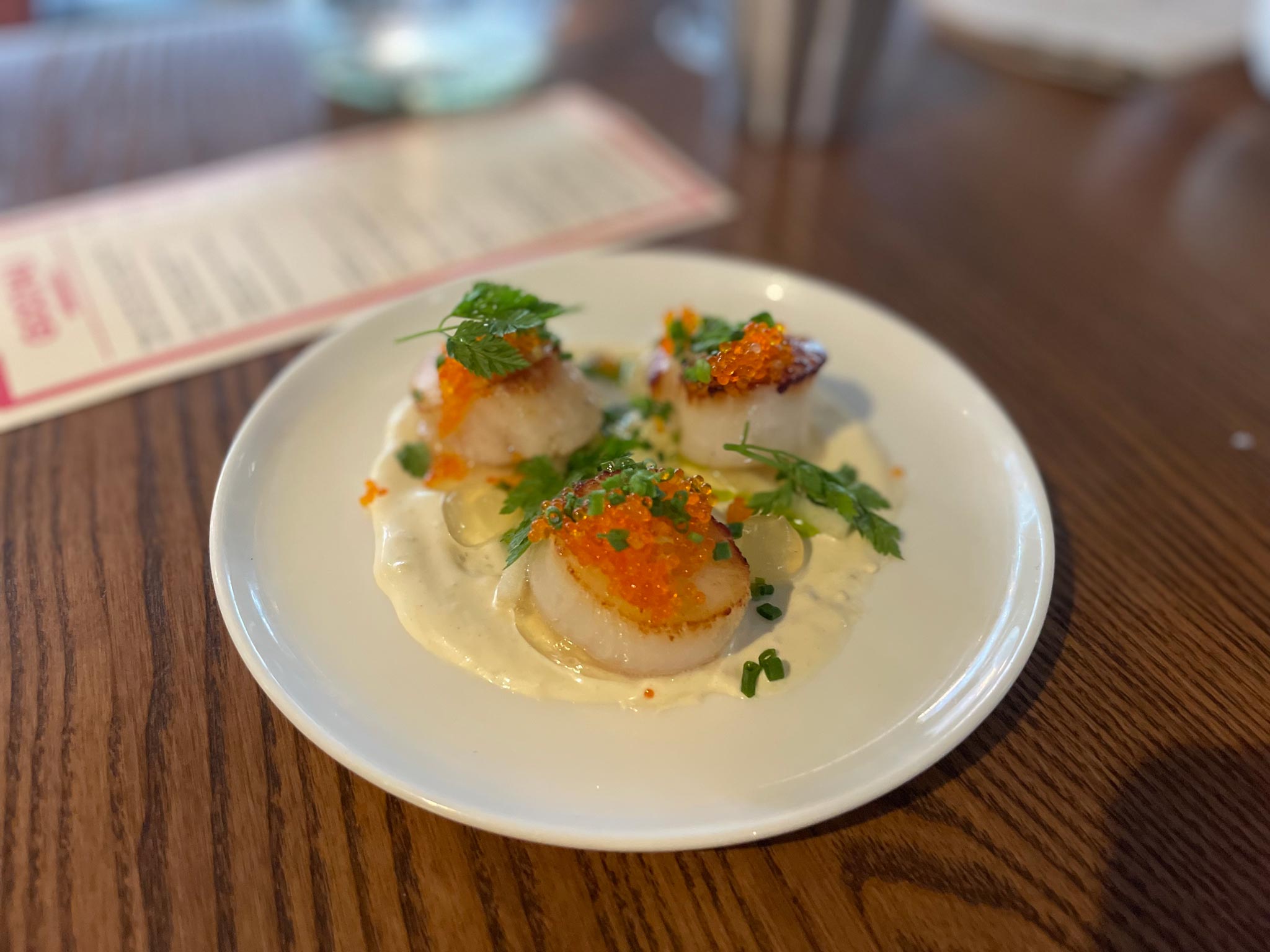 Seared scallops, smoked crème fraîche, apple, finger lime