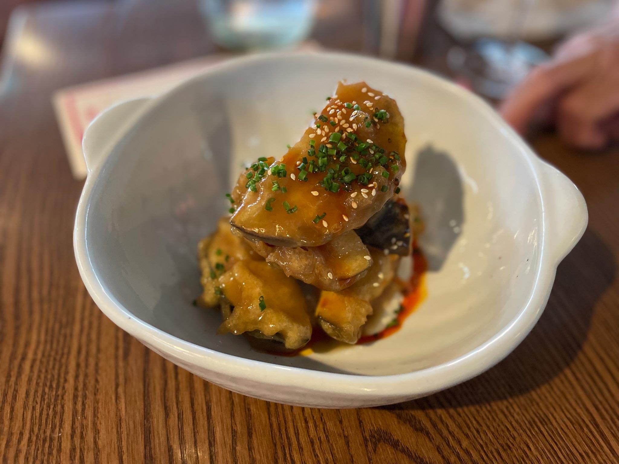 Crispy eggplant, doenjang glaze, tofu cream, sesame