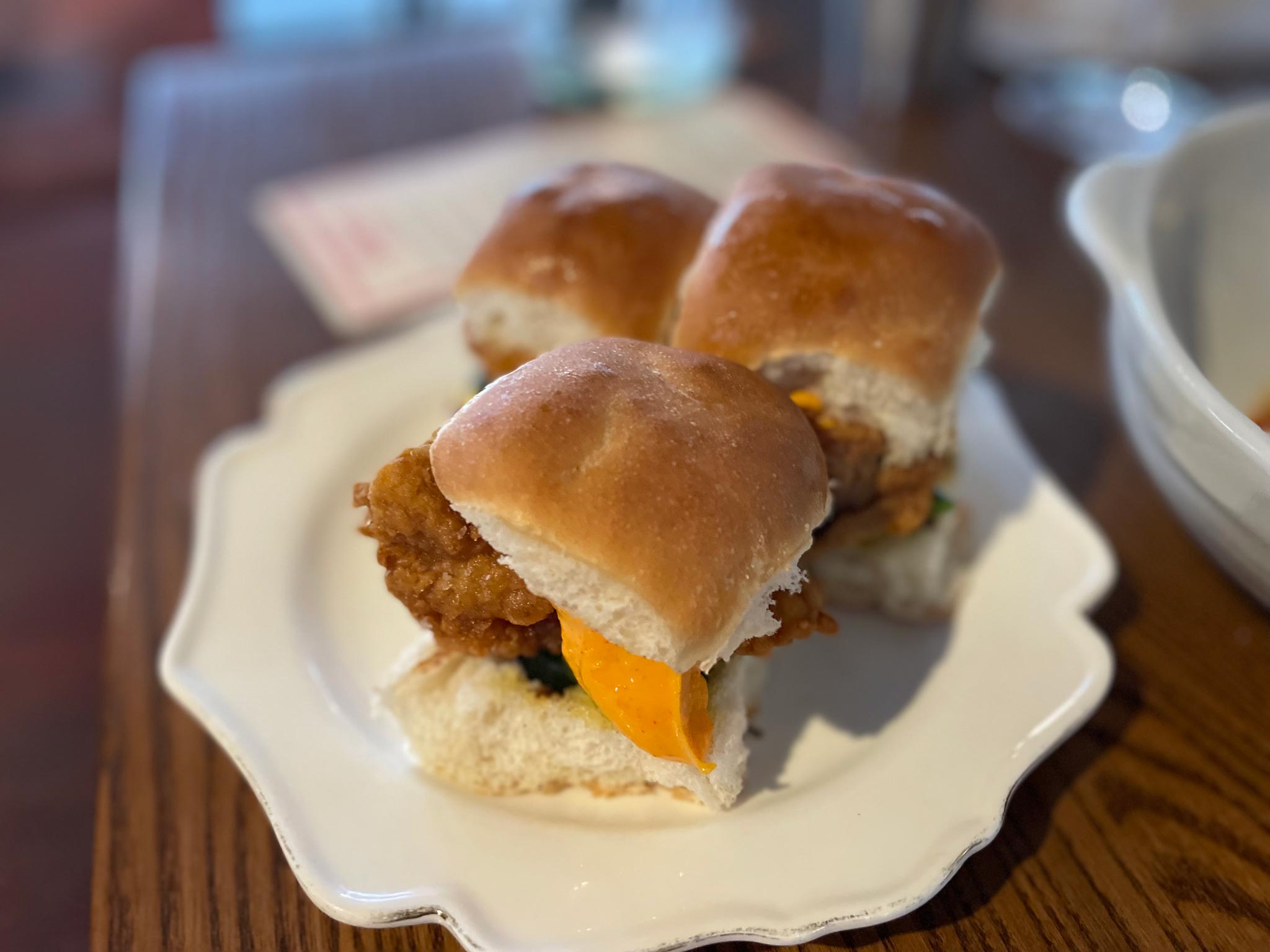 That sauce is amazing, this is fusion at its finest - a pairing of two different cuisines coming together harmoniously. The chicken itself is crispy on the outside and juicy on the inside, the bread is soft and buttery. I'm having a really good time, and I want three more of these.