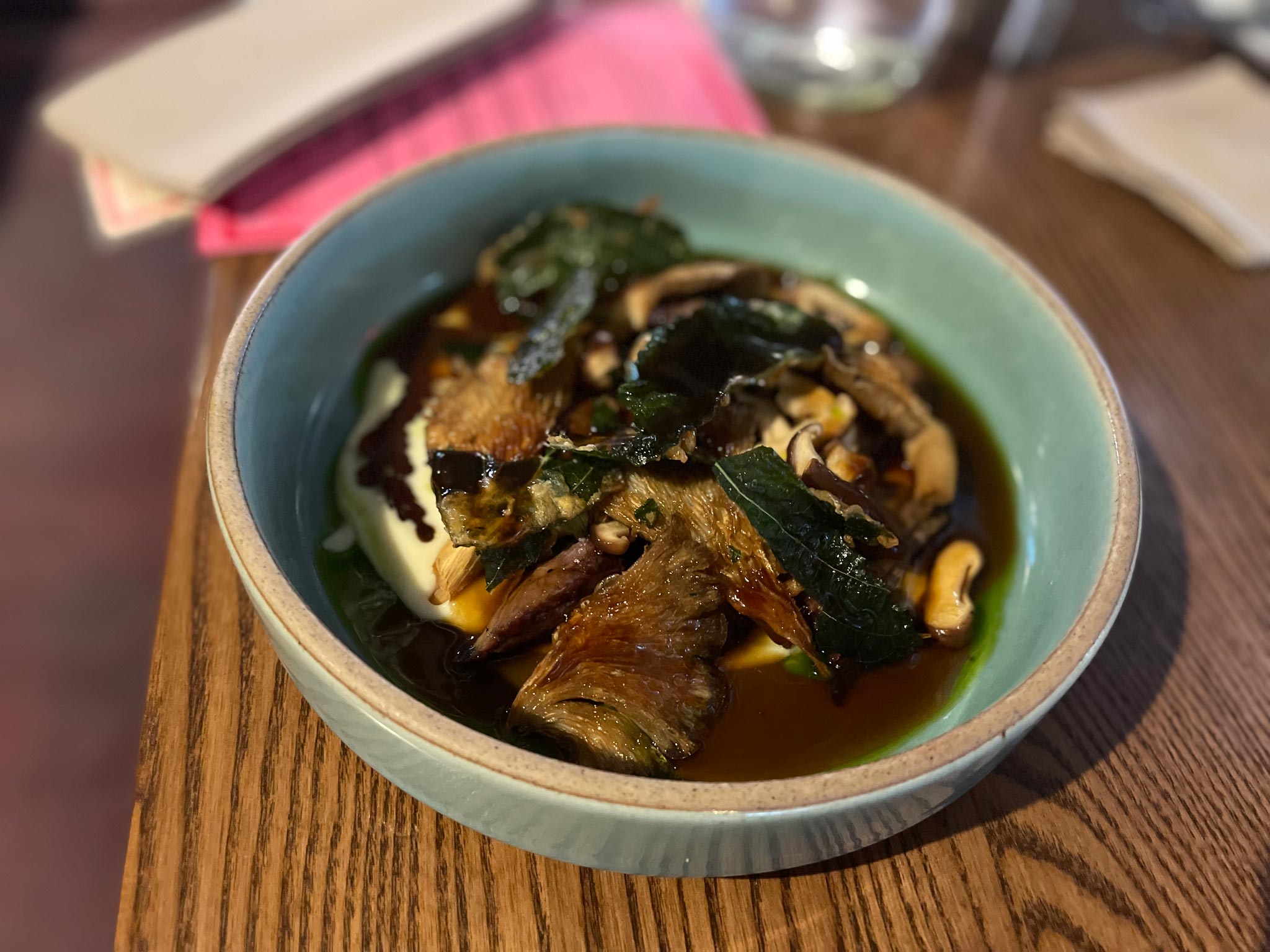 Wagyu skirt, soubise, pickled shiitake, crispy oyster mushroom, perilla