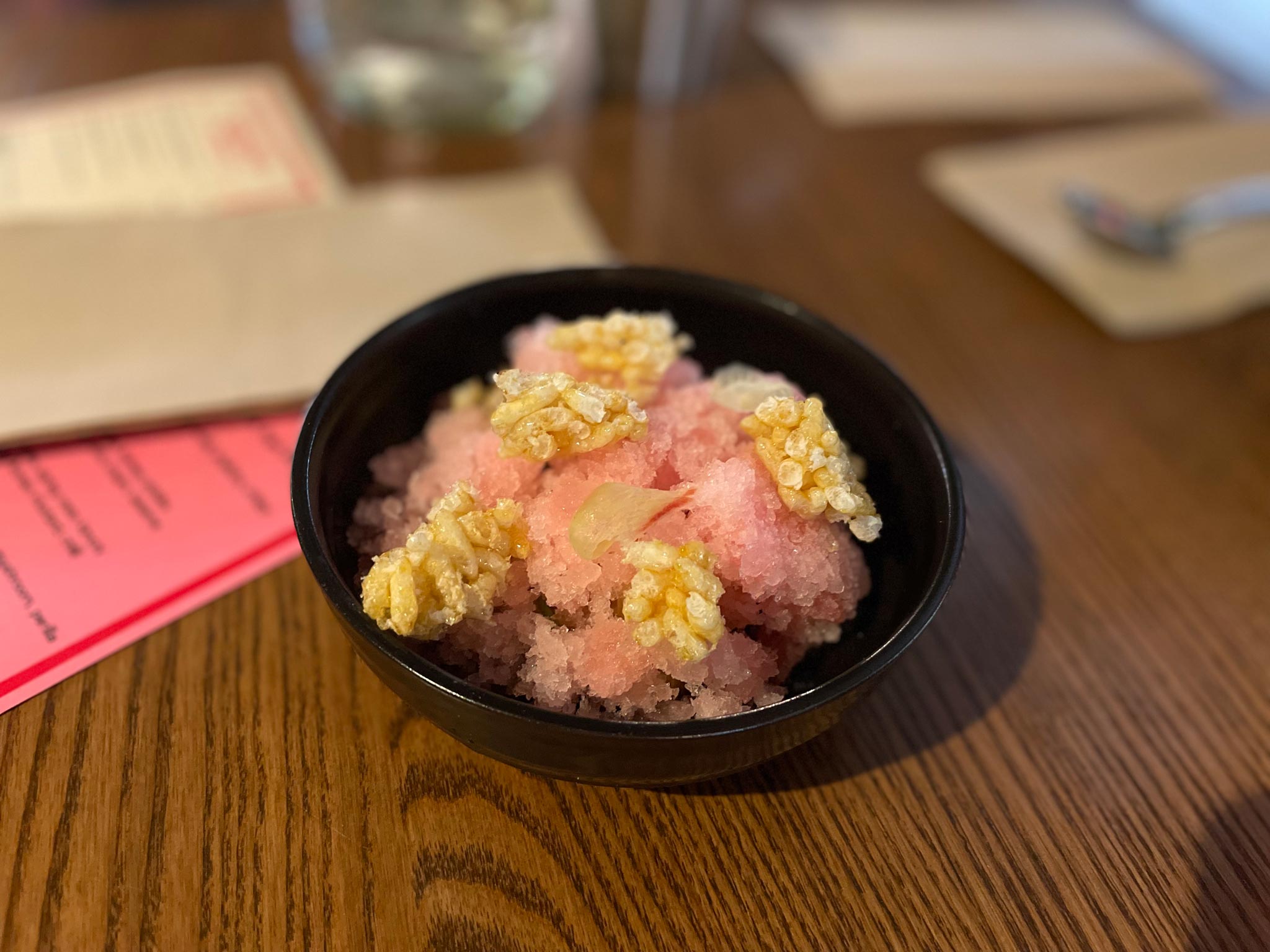 This is a very strange combination of flavours and textures. There's the sweet component from the mousse, which tastes deliciously caramel-like, and is more the texture of smooth peanut butter. The rhubarb granita is quite tart and doesn't match the flavour of the mousse at all, and then there's the crunchy rice. It’s not unpleasant, just very perplexing. I think this would have been better if they had used a flavour like injeolmi instead of rhubarb, which is a flavour I find in many of Toronto's bingsu stores. In fact, they do serve a bingsu here, it's just not part of the degustation.