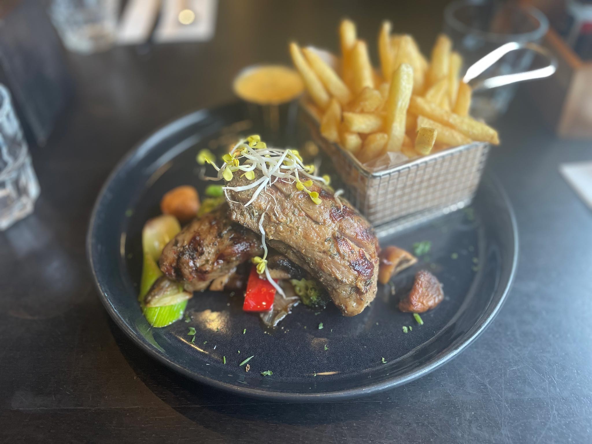 Lamb bearnaise: Grilled lamb rib eye, served with bearnaise sauce, roasted vegetables and French fries