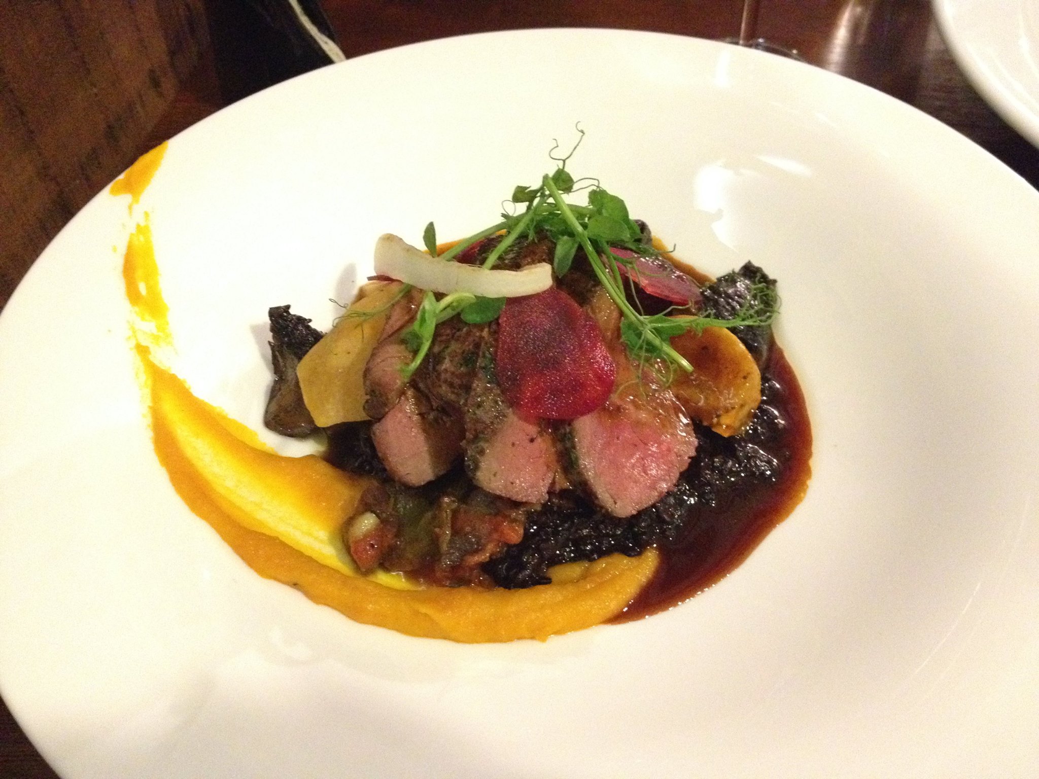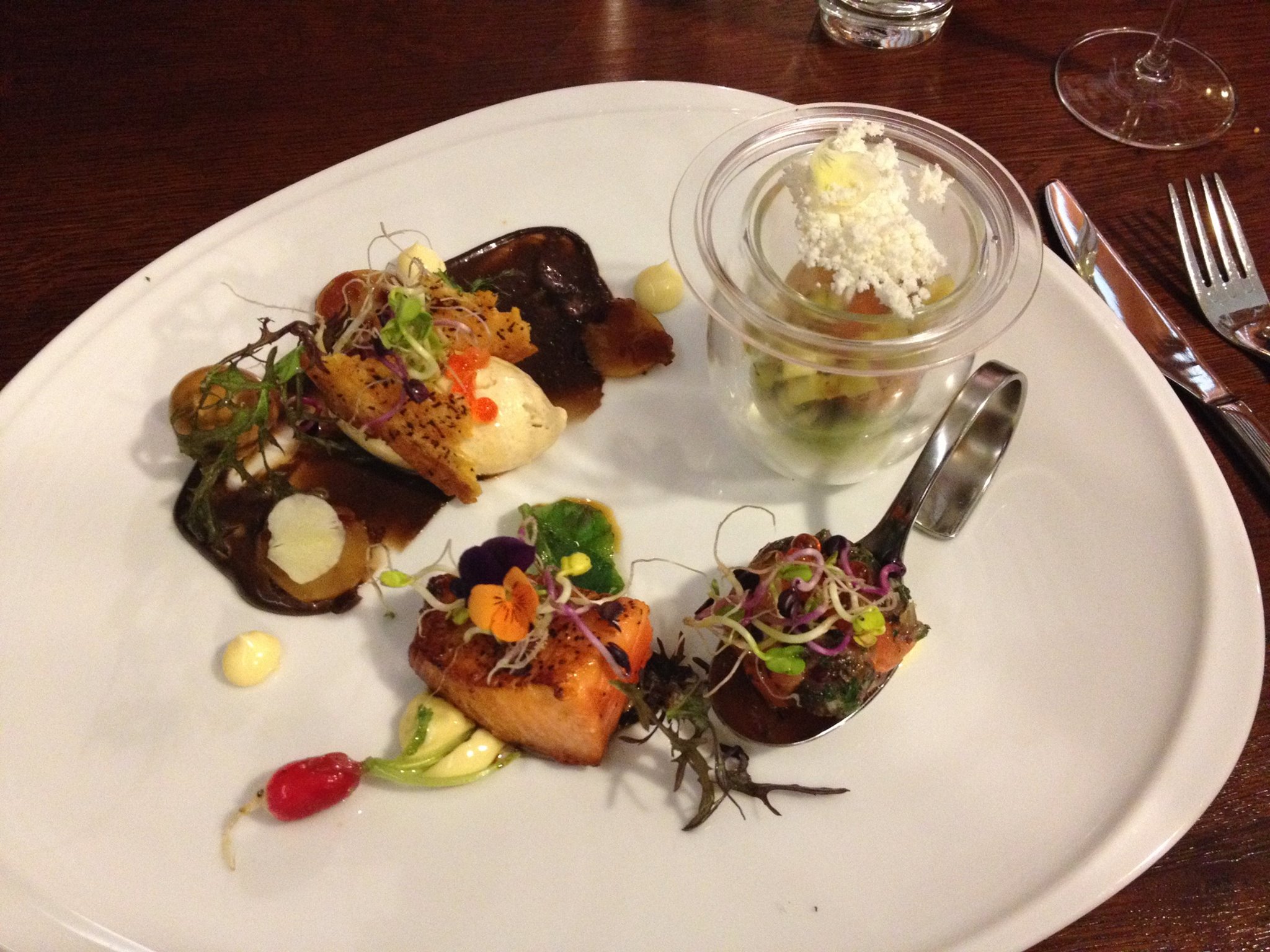 Fantastic presentation, as usual. This dish is actually a competition entry, and there's no doubt as to why - there's a wonderful set of flavours on the plate, showcasing the many different aspects of salmon. There's plenty of freshness, fruits, herbs, sauces that all work together to celebrate the main protein. All the elements have been skillfully selected and purposefully put on the plate, and you can see the care and finesse and skill evident in front of you. What a lovely way to start the meal.