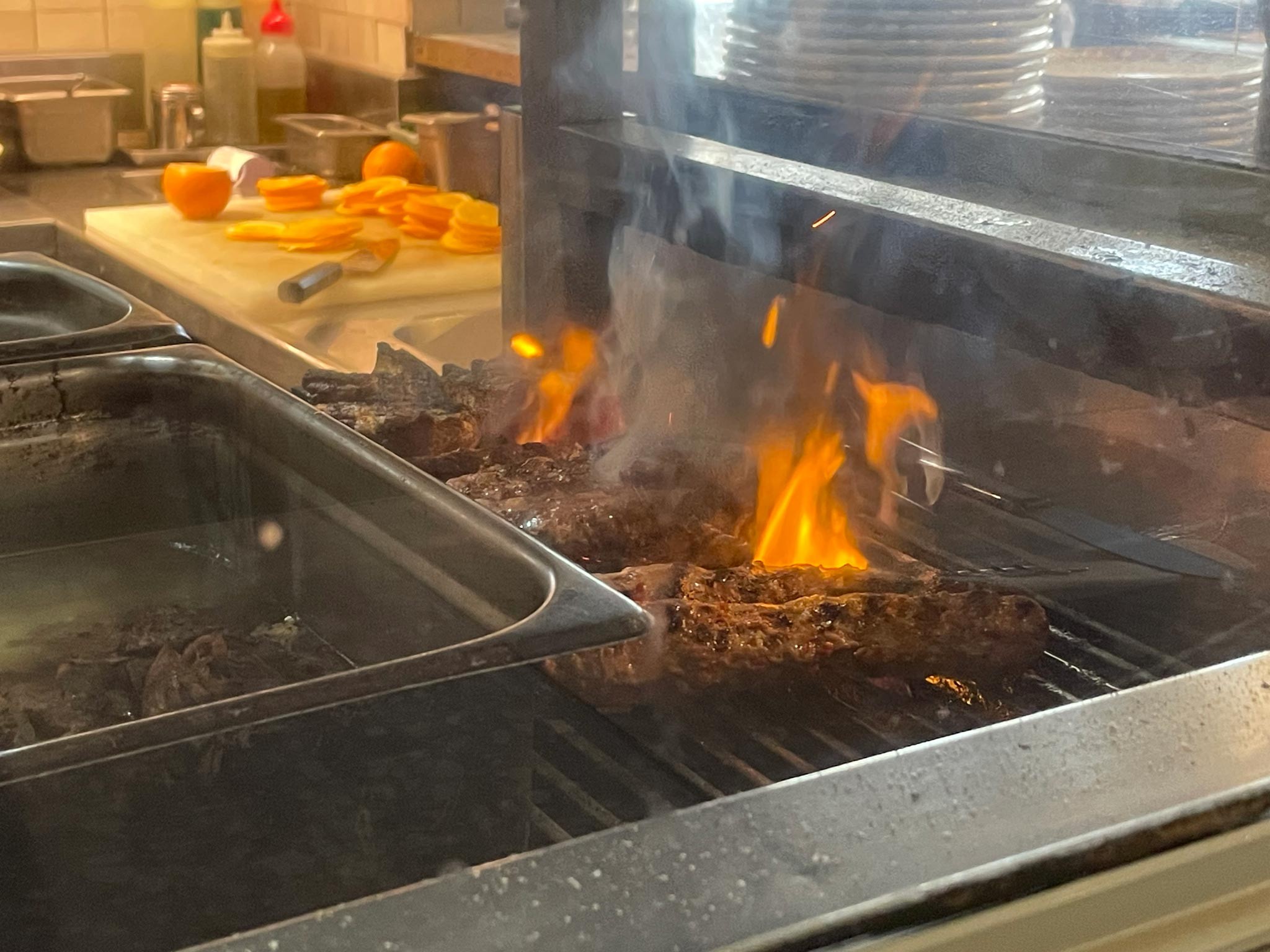 As more people pour into the restaurant, more proteins get slapped onto the grill and the fire starts to come alive from all the drippings. There’s a beautiful array of meats resting above, and a dozen plates of hummus ready to go on the bench opposite, with what looks to be about a hundred slices of orange. Further into the kitchen, the pita bread dough is being prepared and rolled out. I love how orderly and mechanical the kitchen is, and it really is such a joy to observe.