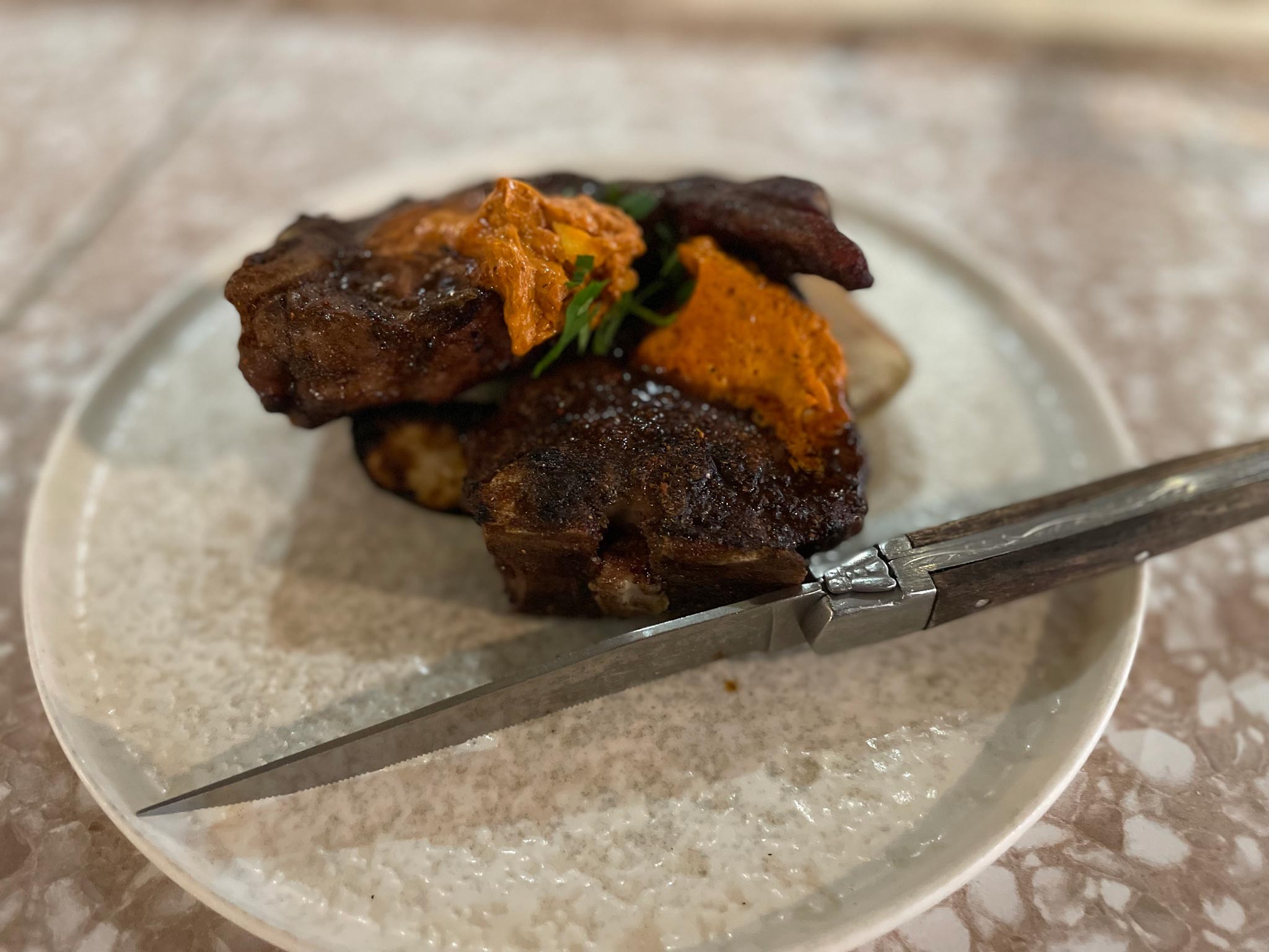 Oh my god that fat is rendered perfectly, and that wonderful smokiness from the grill comes through beautifully. The lamb is flawless and I would happily consume another one. The pear doesn’t really do much for me but that butter really helps accentuate the flavour of the meat, keeping it moist and juicy. I am definitely going to grab the bone with my hands and savagely rip all the meat off until it’s clean. Phenomenal.