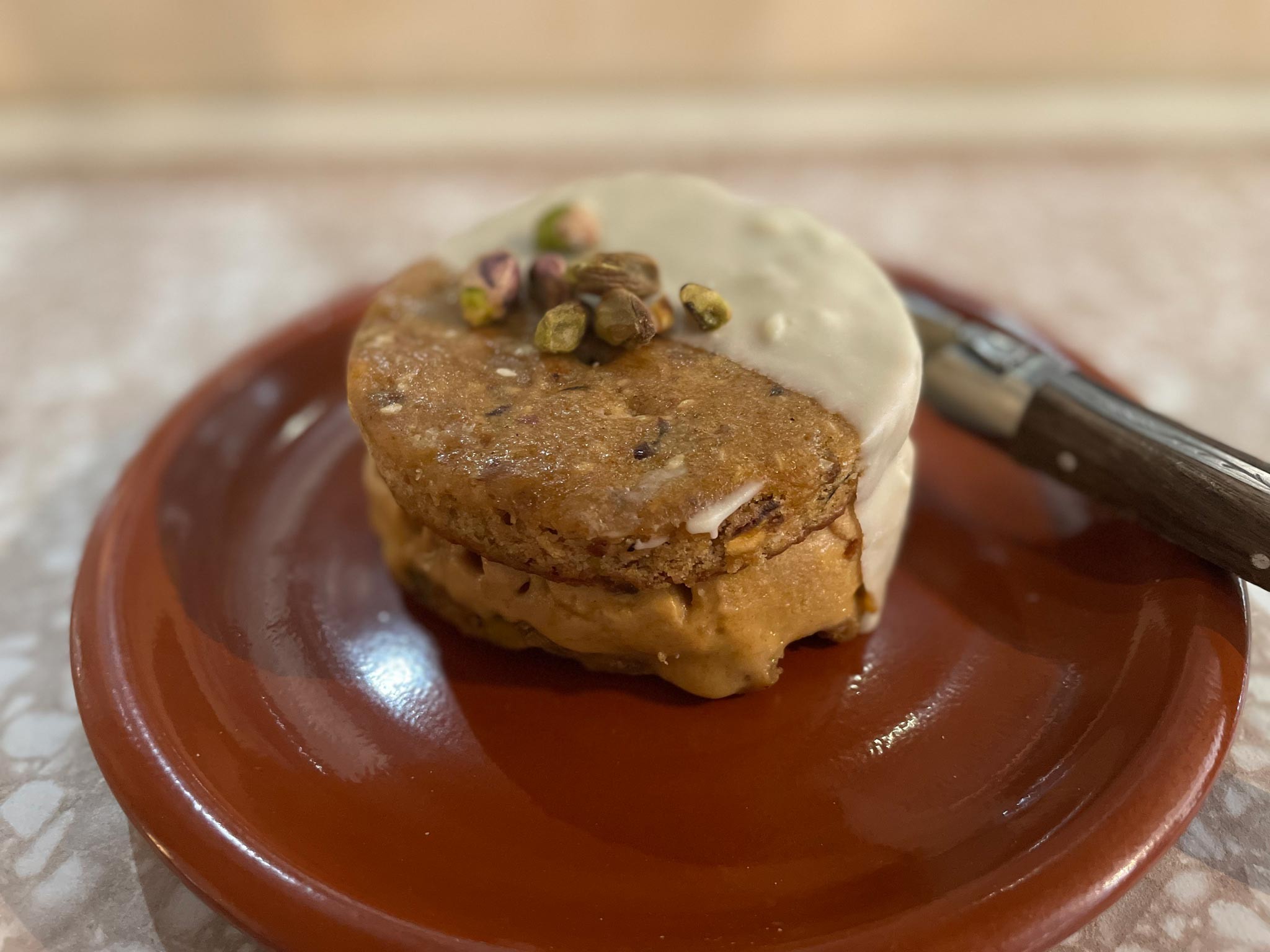 Candied pumpkin ice cream sandwich, pistachio sesame biscuit, saffron white chocolate