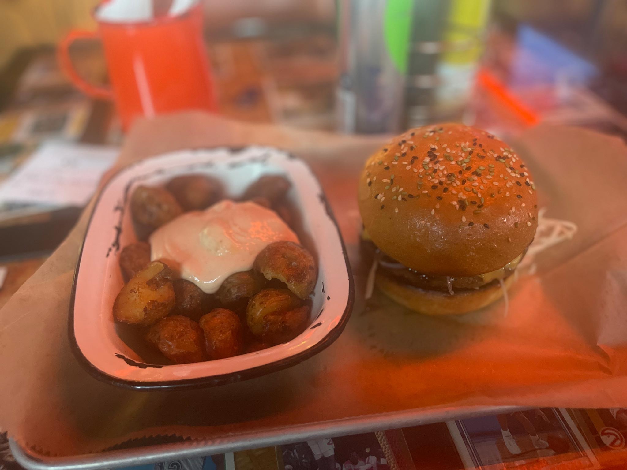 The potatoes are really nicely seasoned, fluffy on the inside and that KocK sauce is rich and creamy. I think it’s mayonnaise with paprika and something else like chipotle. There’s a lot of potato so I know I won’t be hungry at the end of this. The burger is solid and satisfying, it’s delicious and juicy. The cabbage here is the textural element, and the tomato and pickles add that acidity to balance everything out.