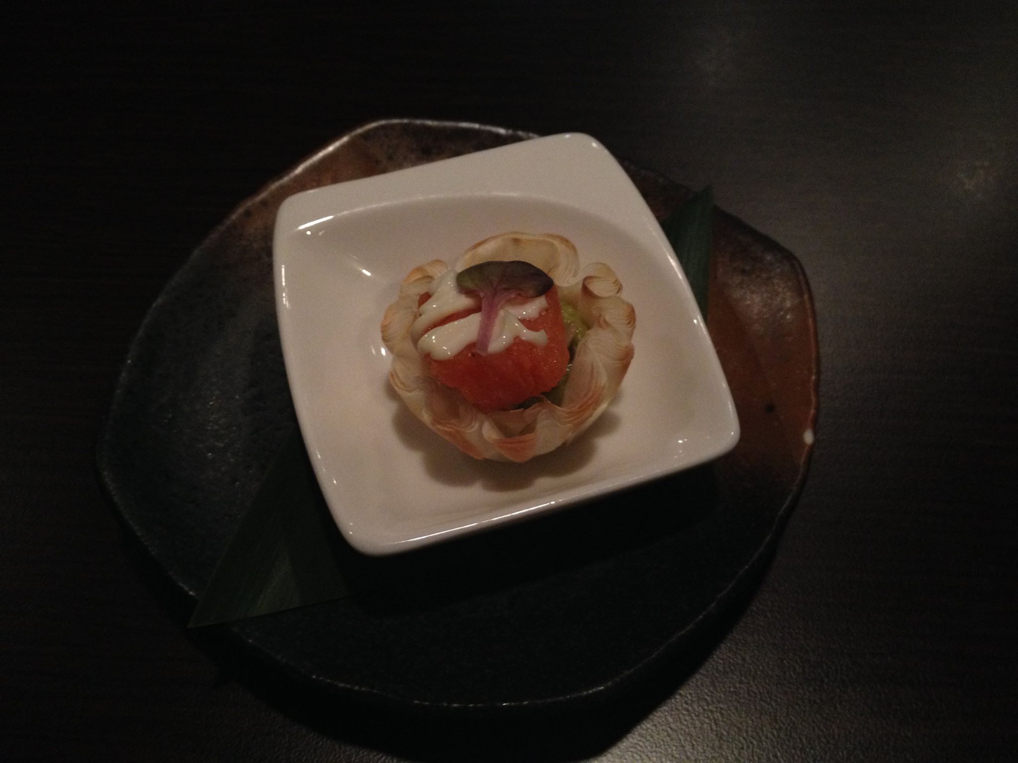 Fresh Tuna, Salmon, White Fish, Shiso Leaves wrapped with Rice Paper, Japanese Pickled Plum Miso Sauce, Soba Seeds, Crispy Shrimps