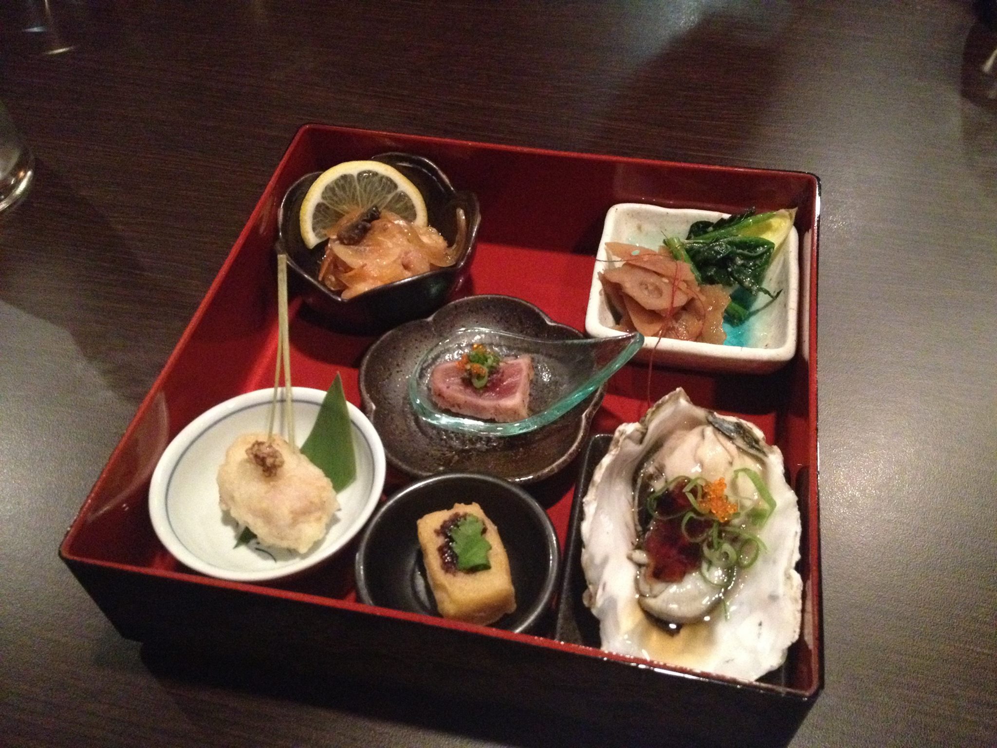 Today's selection was mushroom and deep fried monk fish, beef tataki, tuna tataki, tempura oyster, mussels and lotus root and sesame green bean. Each individual appetizer had its own unique, delicate flavour; the seafood, I remember, was full of natural flavours highlighted with whatever mayonnaise, sesame or soy accompaniments. The standout dish to me was the tempura oyster - amazing texture on the inside and outside. Looooove oysters.