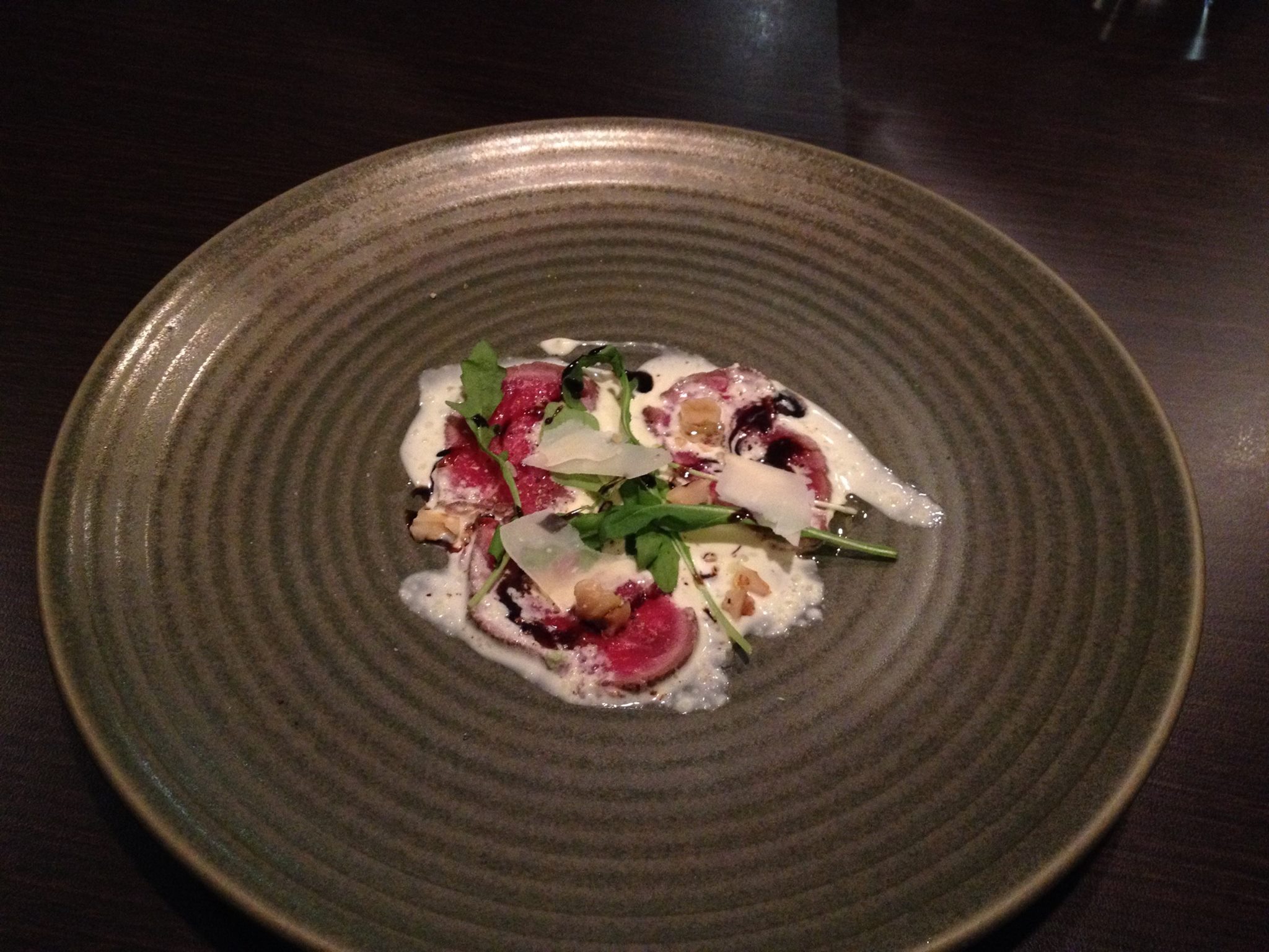 Beef Tataki Carpaccio: seared raw beef, wild rocket, wasabi cream, truffle oil, balsamic soy, walnut, sliced parmesan