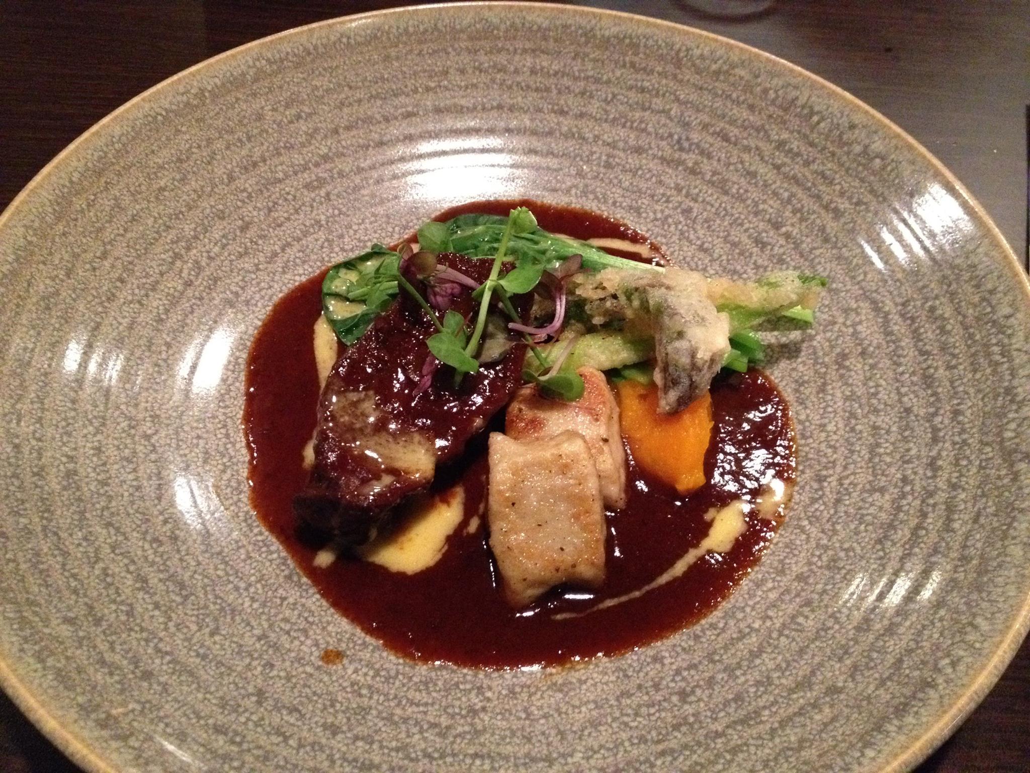 Slow Cooked Braised Beef Cheek: Japanese taro gnocchi, pumpkin puree, tempura asparagus