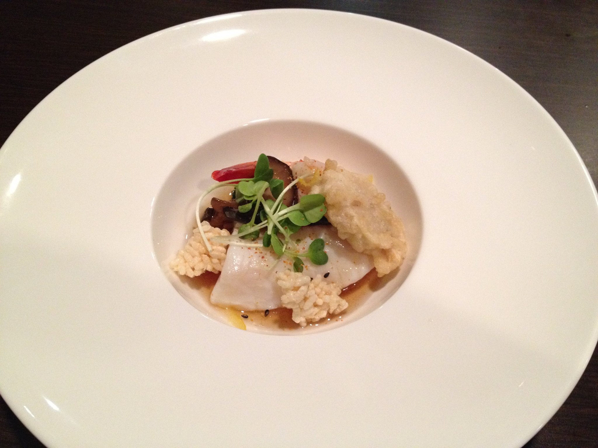 Steamed Blue Cod: with prawn, tempura battered stuffed lotus root, Yuzu citrus flavoured shiitake mushroom dashi sauce
