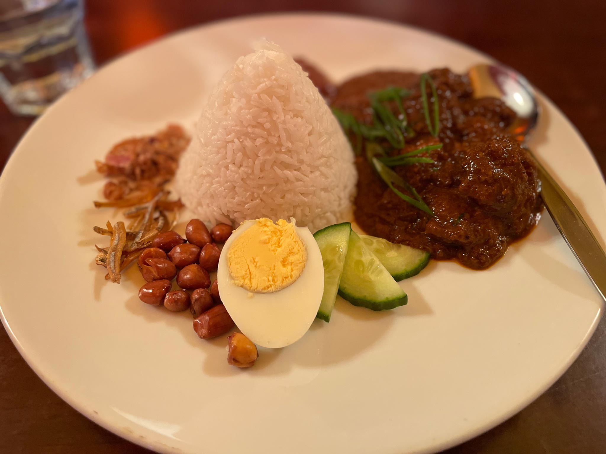 Nasi lemak: steamed coconut rice served with a boiled egg, peanuts, anchovies, tomato sambal and lamb rendang