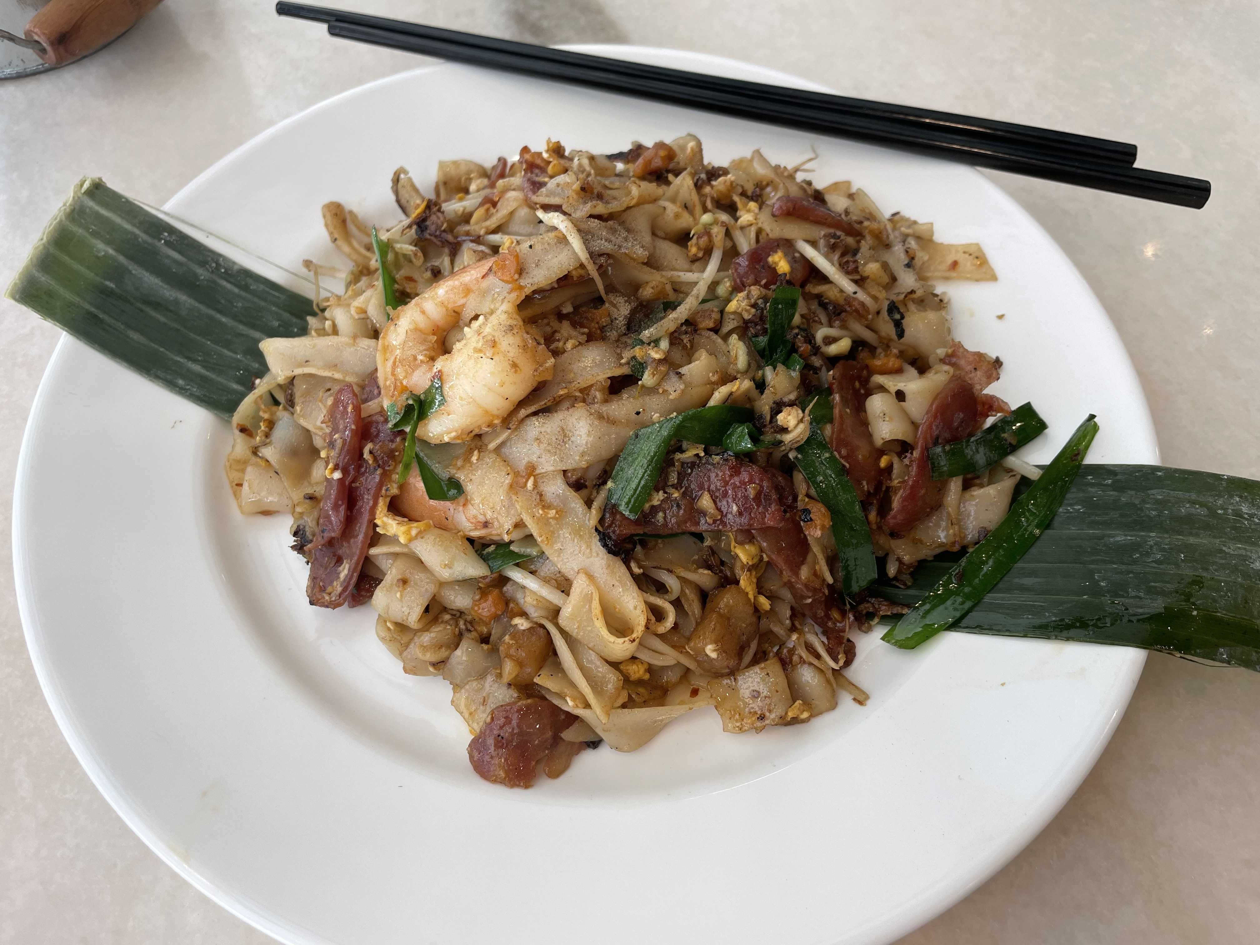 Char Kuay Teow: Flat rice noodles fried with prawns, Chinese pork sausage, chives and beansprouts