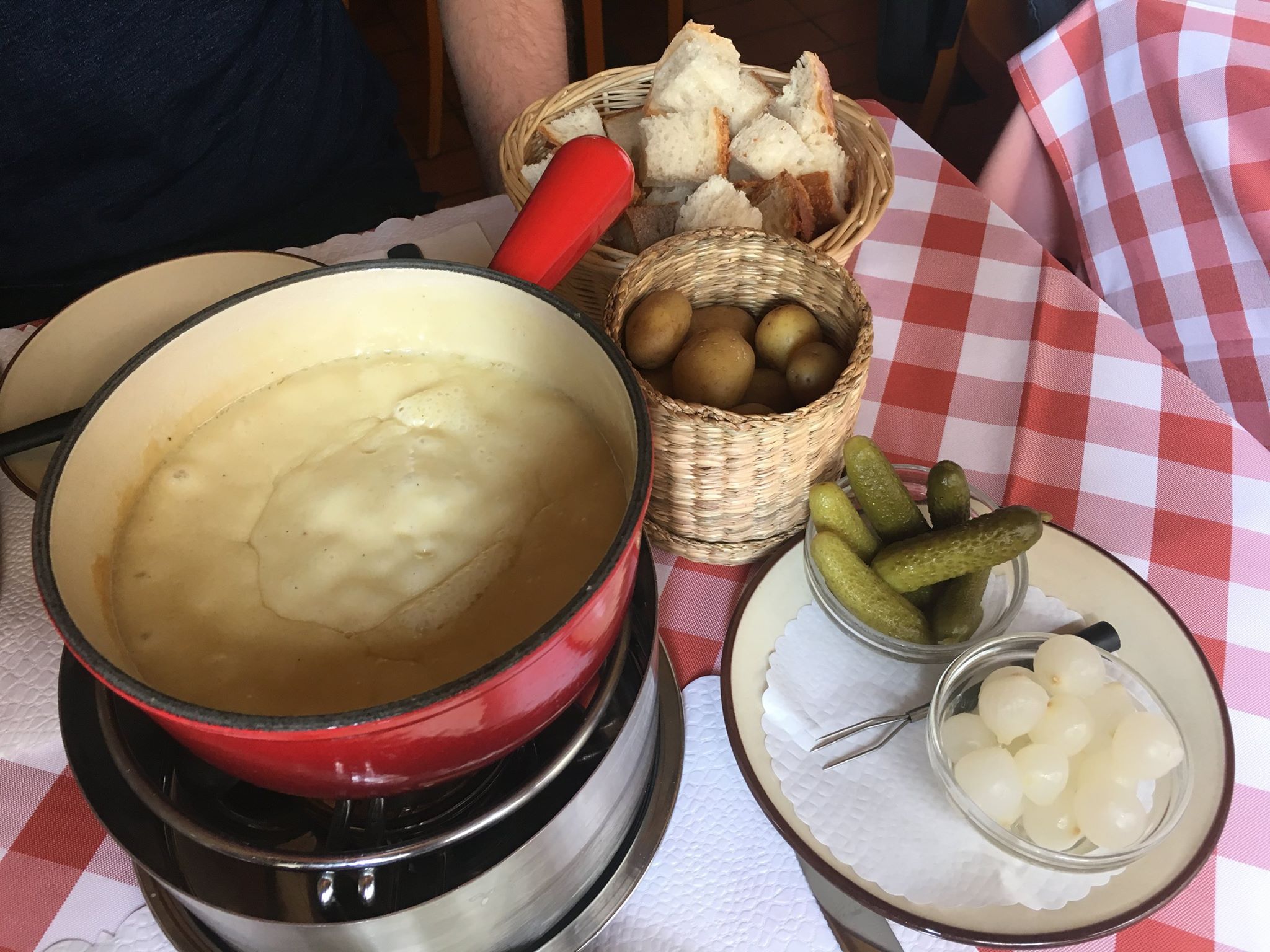 Fondue Fribourgeoise - half gruyere, half vacherin cheese with wine and kirsch, with picked onions and gherkins