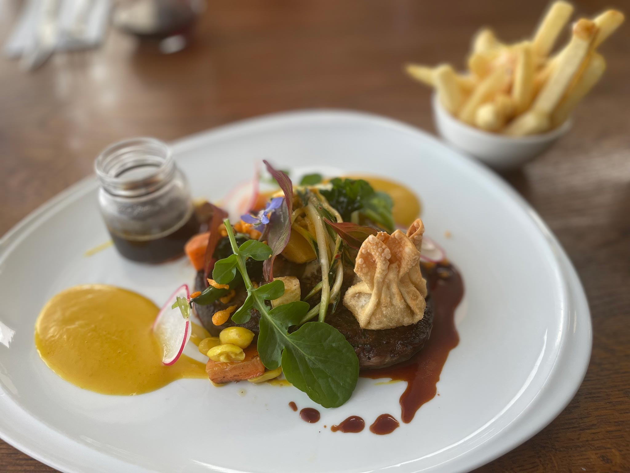 Prime beef scotch fillet steak: mustard hollandaise, crayfish wonton, herb vegetable, crispy potato chips, beef jus