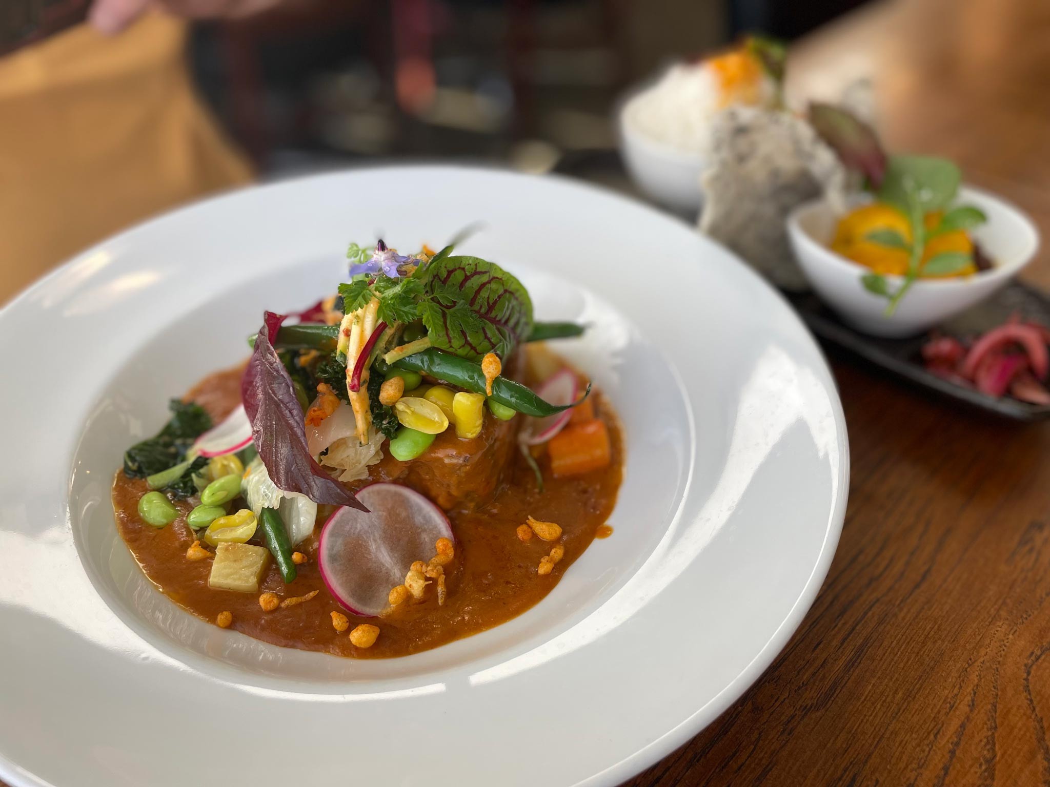 Chikos style kare kare: tender braised angus beef shin, rich annatto garlic peanut gravy, selected vegetables, chili coconut bagoong, fragrant jasmine rice