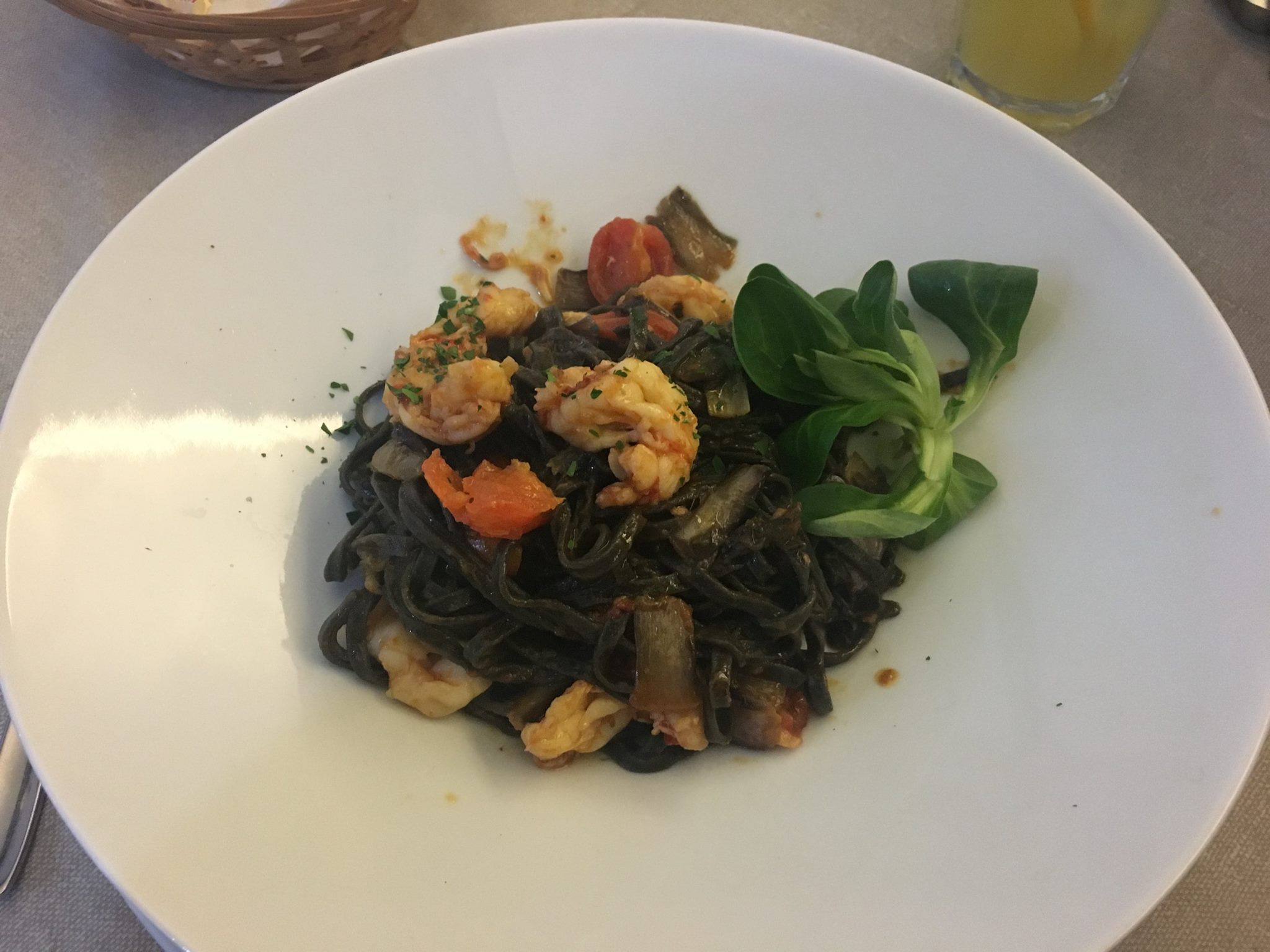 Tagliatelle Nere con Gamberi Verdura di Stagioni - black tagliatelle with prawns and seasonal vegetables