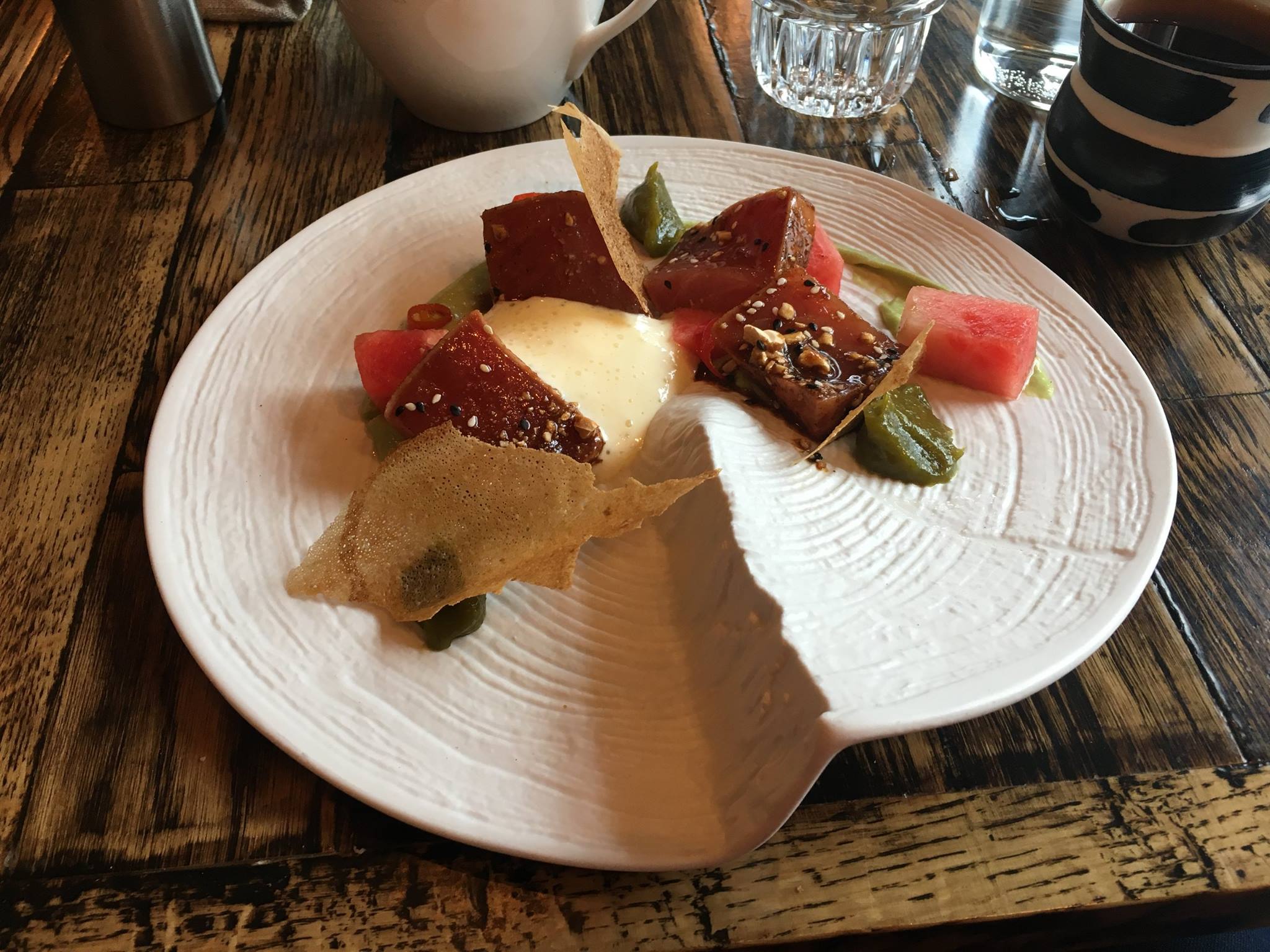 Classic flavours here, but the wasabi is milder than I would have liked. The tuna is fresh and has a good bite to it, and a little sprinkling of nuts on the table gives the dish some crunch. I really like the slightly sweetness that the watermelon adds. I'm also amused by the odd plate, which cements my conclusion that I'm in one of Iceland's most hipster cafes.