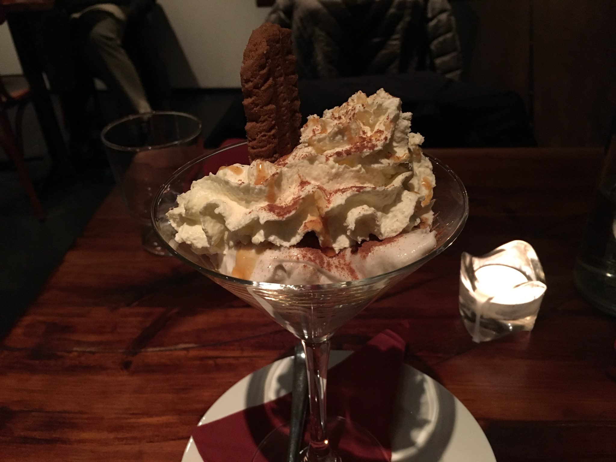 Skyr is a traditional Icelandic dairy dessert that is very much like yogurt, but lacks the sharp acidity - it's much milder than yogurt. The texture is very similar, almost bordering a consistency of custard. The pieces of spiced apple and cinnamon strewn through the dessert, and the gingerbread biscuit on top, makes this a pleasant dessert and a nice way to end the meal.