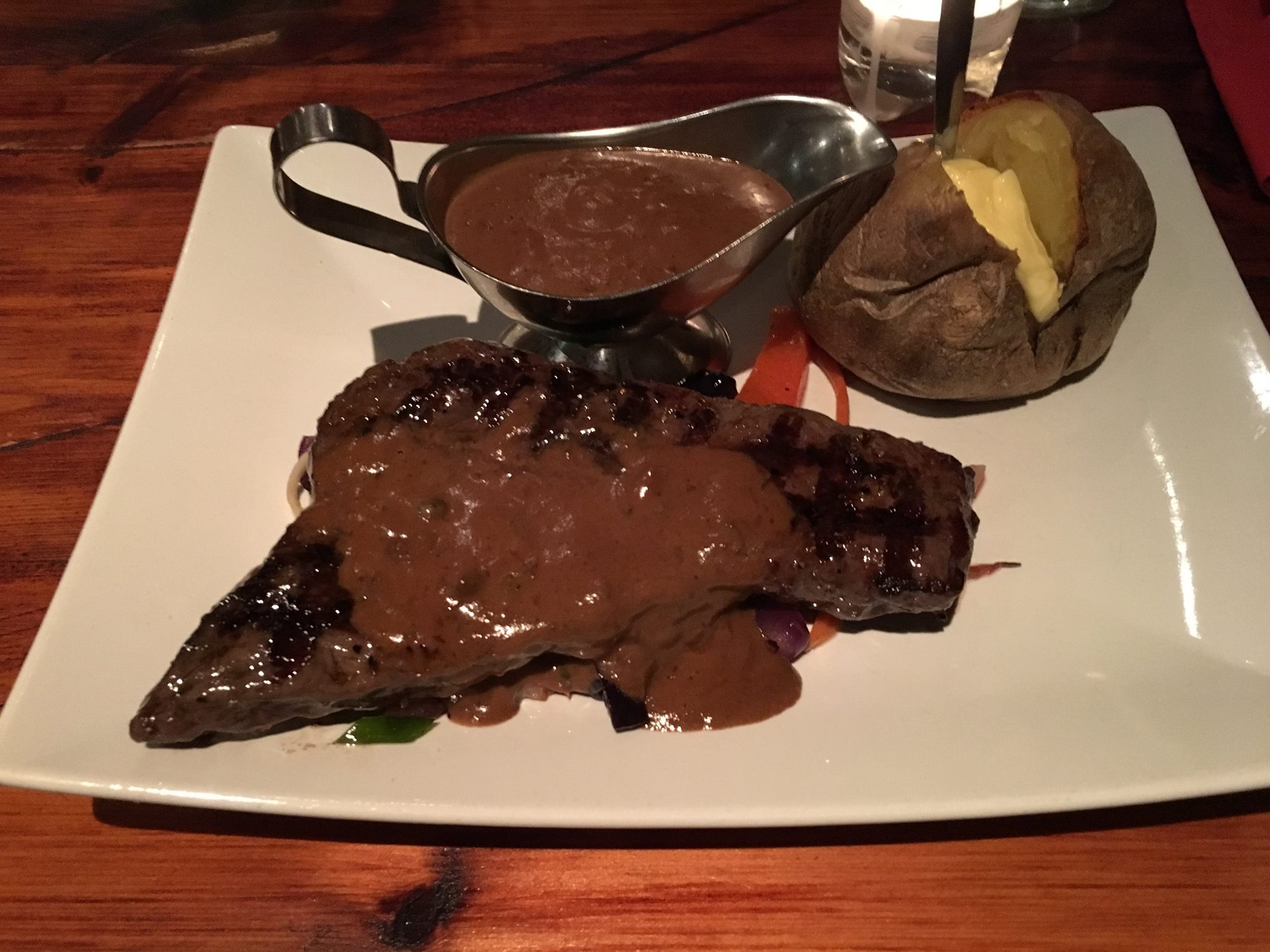 I'm surprised with the first bite. It tastes very much like red meat, but it is chewier and very lean. I was expecting something a bit fatty, with perhaps some fishiness to it. They've done a good job with the gravy and vegetables, and it's got that "winter warmer" feel to it. I'm impressed with the baked potato too.
