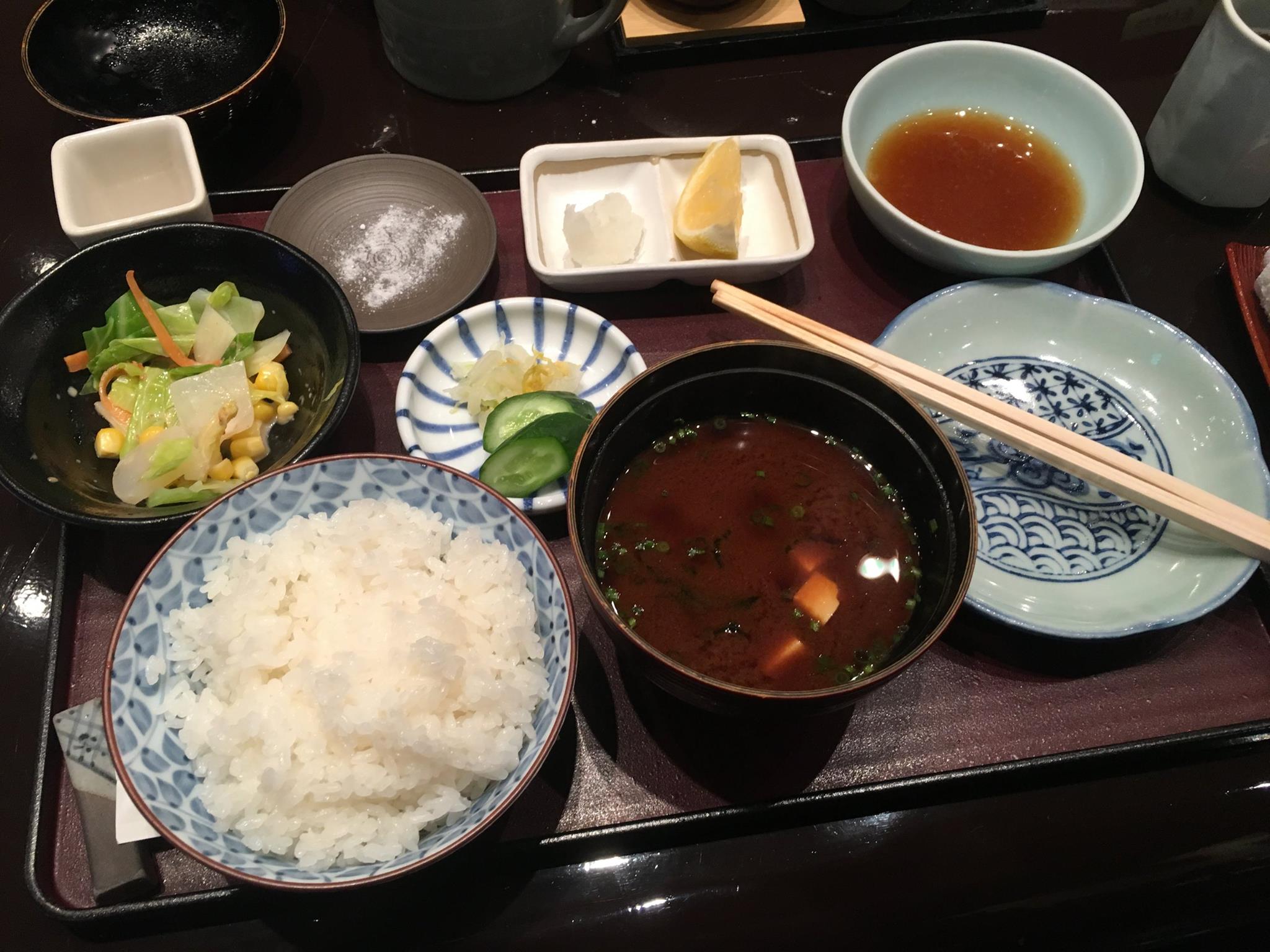 I order a tasting menu. The base set comes with salad, rice, miso soup, and various saucers for the condiments available - tempura sauce, lemon and rock salt.