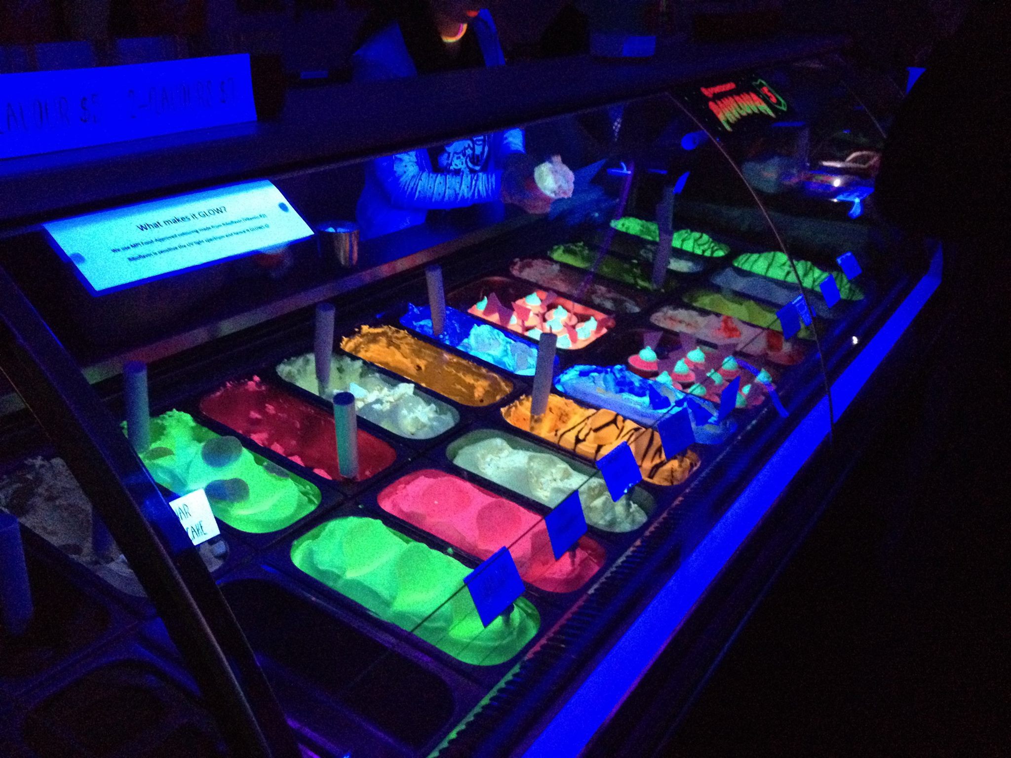 Naturally, the first question that comes to mind is "what makes it glow?". Rest assured, the answer is simple, edible and natural: vitamin B2 (riboflavin) and vitamin B12 additives to the gelato cause it to fluoresce under ultraviolet light. Go science!