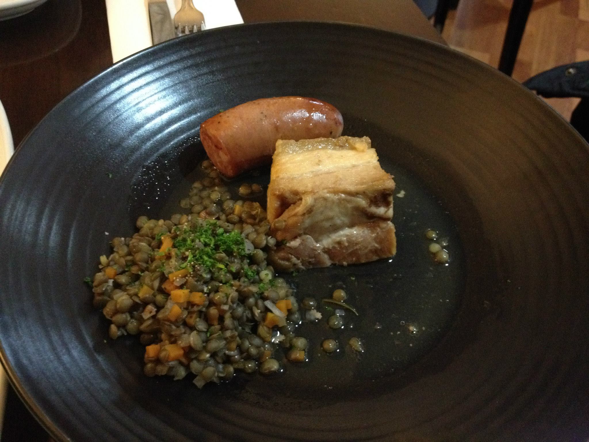 Preston's cured, slow-cooked pork belly with puy lentils and On Trays smoked sausage