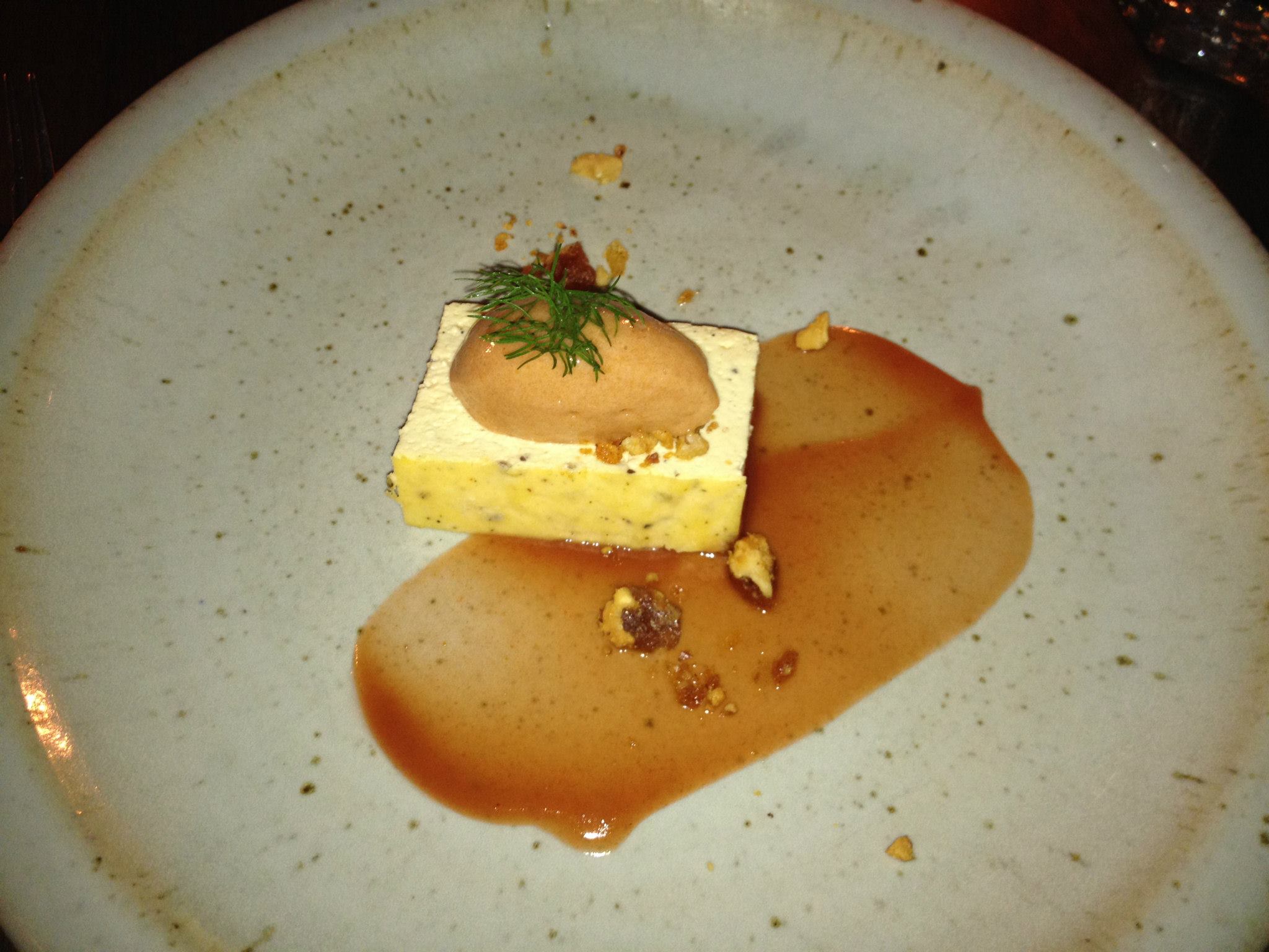 Interesting but confusing set of flavours. The cheesecake is salty and peppery like pâté. There's an apricot sorbet with fennel on the top and a tomatoey jam on the base with candied walnuts. It's sweet and savoury and the combination is thought-provoking, but I'm not a fan.