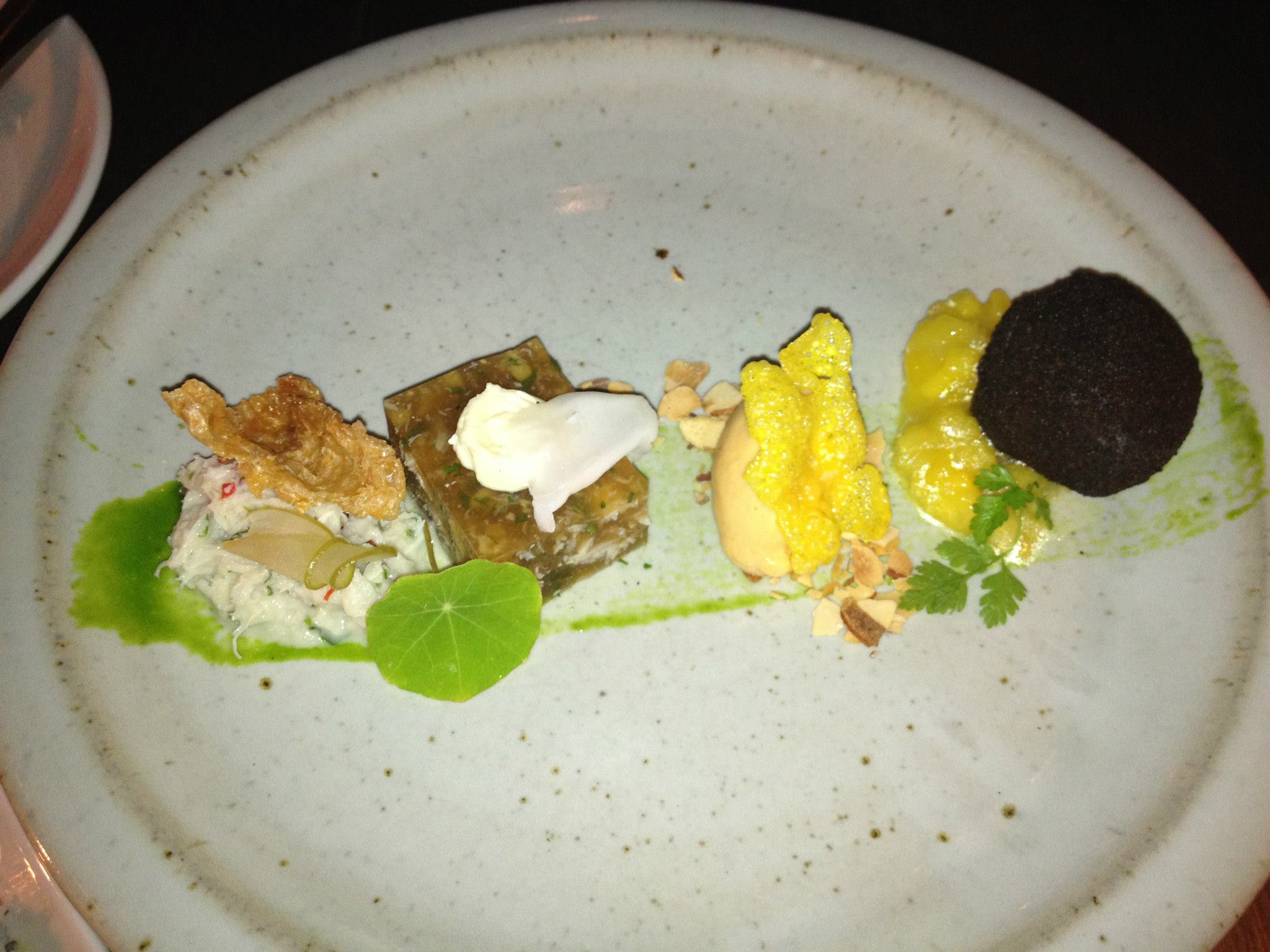 Crab salad, crab gel, crab roe ice cream and crumbed crab ball