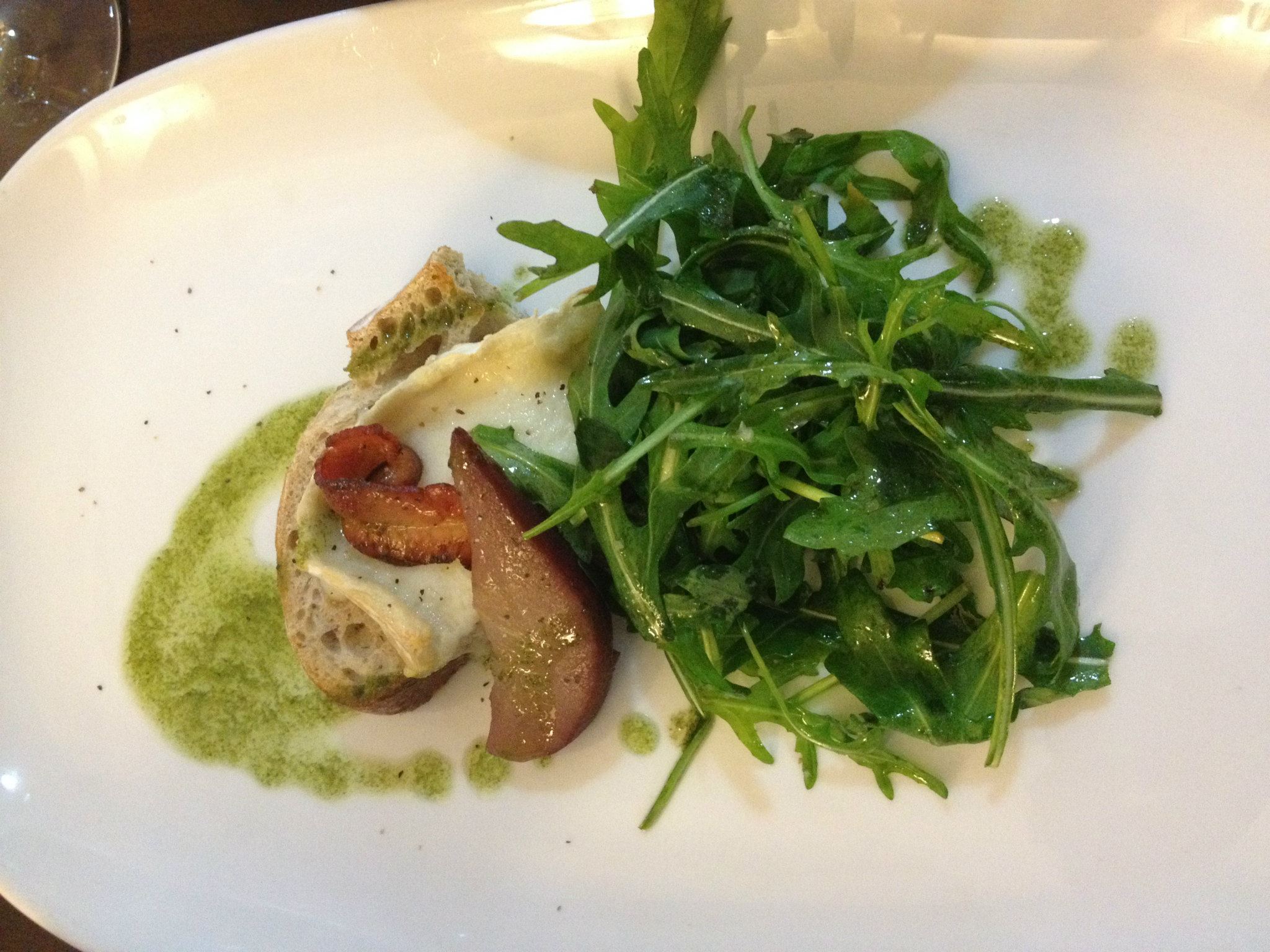 With rocket, mulled red wine pear, On Trays smoked bacon and housemade warm bread