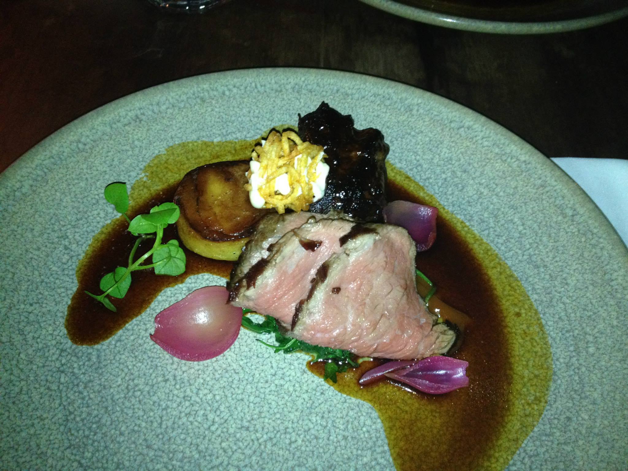 With glazed cheek, arugula, red wine onions, potato fondant and garlic caramel