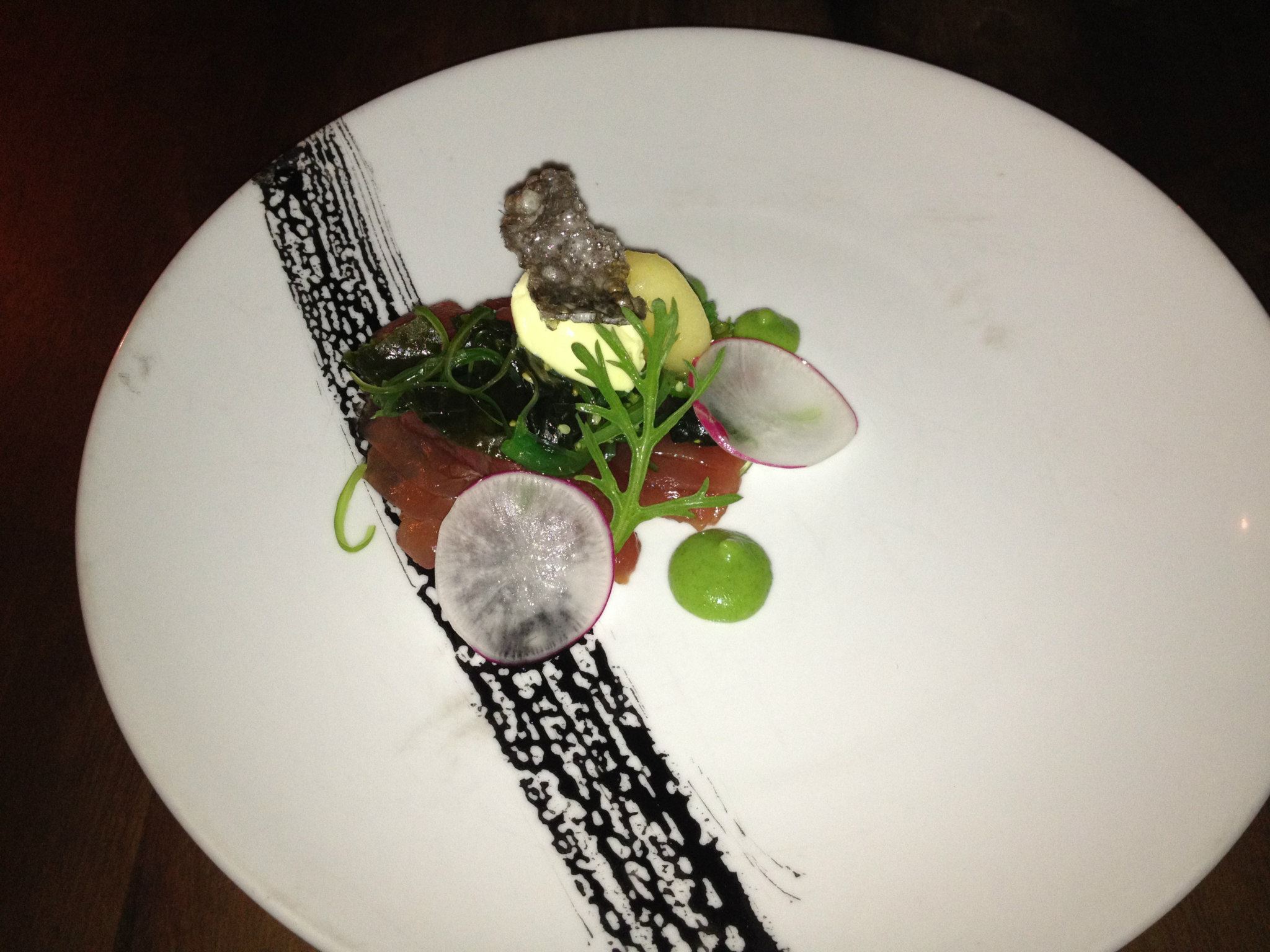 Fantastic texture with a strong taste of freshness and a lovely hint of wasabi to really open the nostrils. There was a good balance between the natural saltiness of the tuna and the bittersweet citrus flavours of the yuzu. The seaweed had crunch and the fish had bite, but was still silky smooth as you'd expect fine sashimi to be. Great start to the night, and loved the elegant artistic brush of squid ink on the plate.