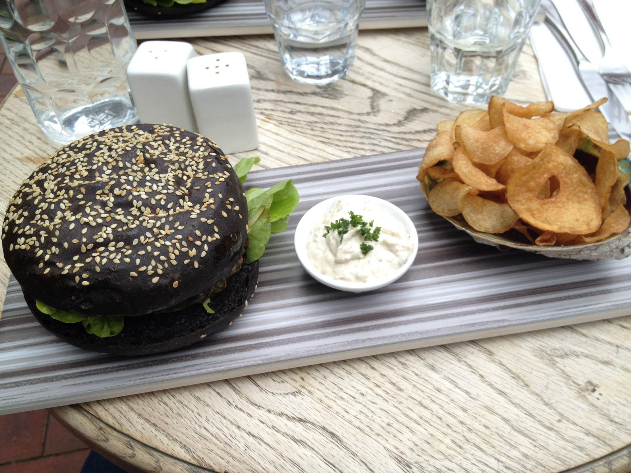 Moana Pacific paua and PrimeStar pork patty with caramelised pineapple, pickled cucumber in a Zaida's squid ink bun, with salt and vinegar chips and Kiwi onion dip