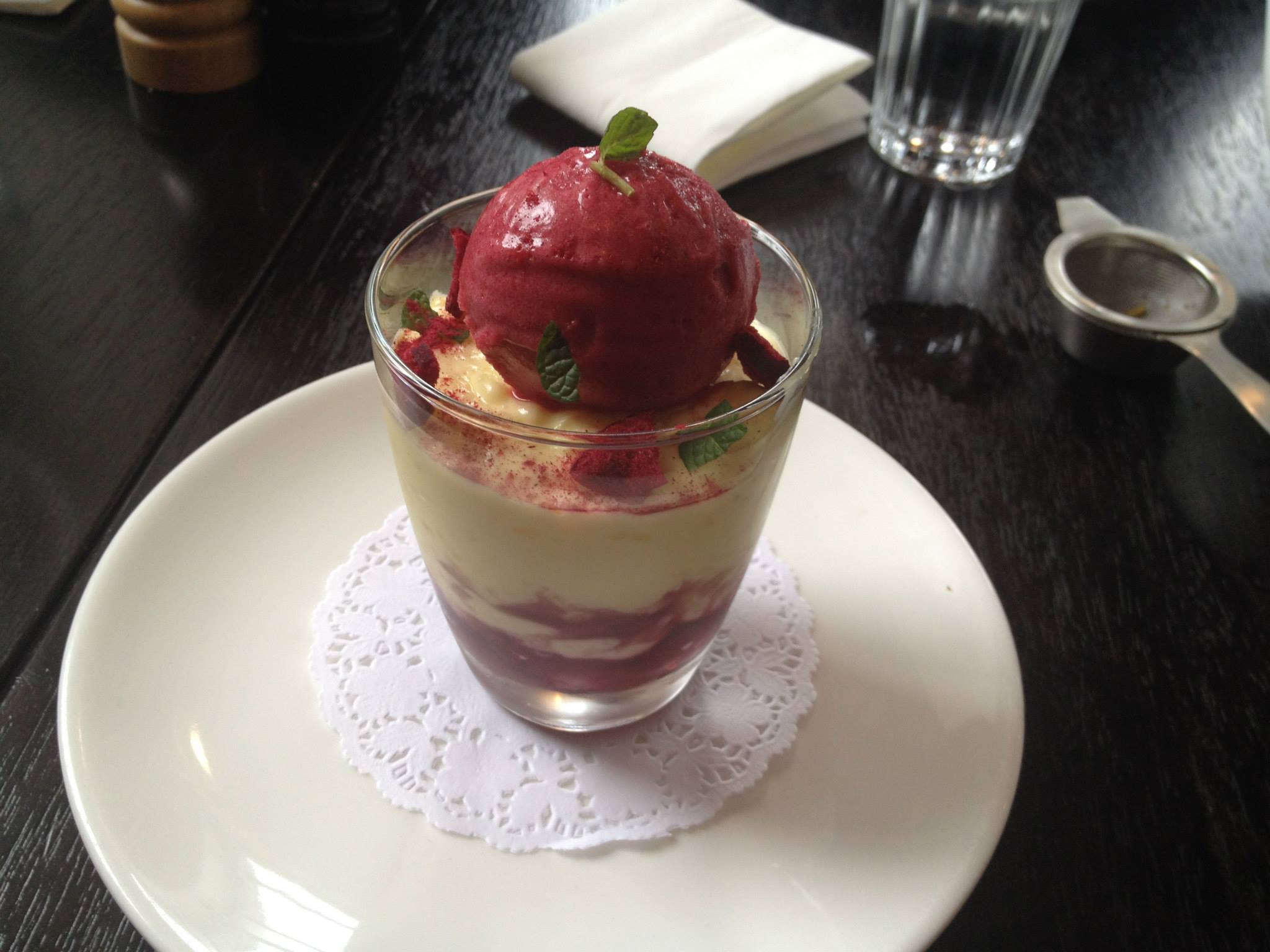 With rhubarb sorbet and freeze-dried raspberries