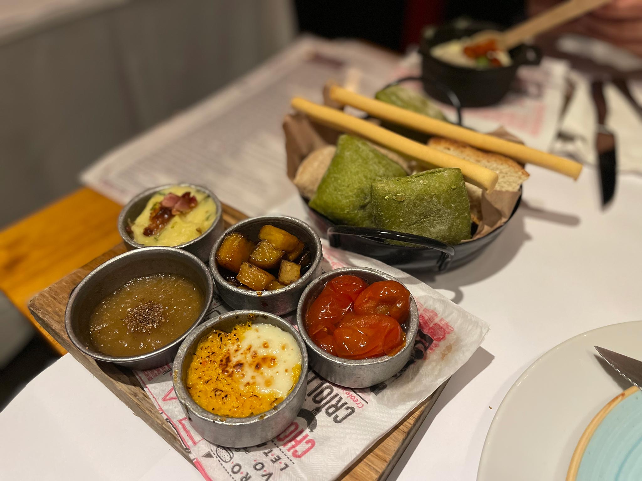 Quickly, a bunch of sides arrive, and even they look absolutely stunning with all their different colours. There’s apple sauce, roast tomatoes, potato mash with bacon, corn mash, roast yam, a blue cheese and pickled onion mix, and various kinds of homemade bread.
