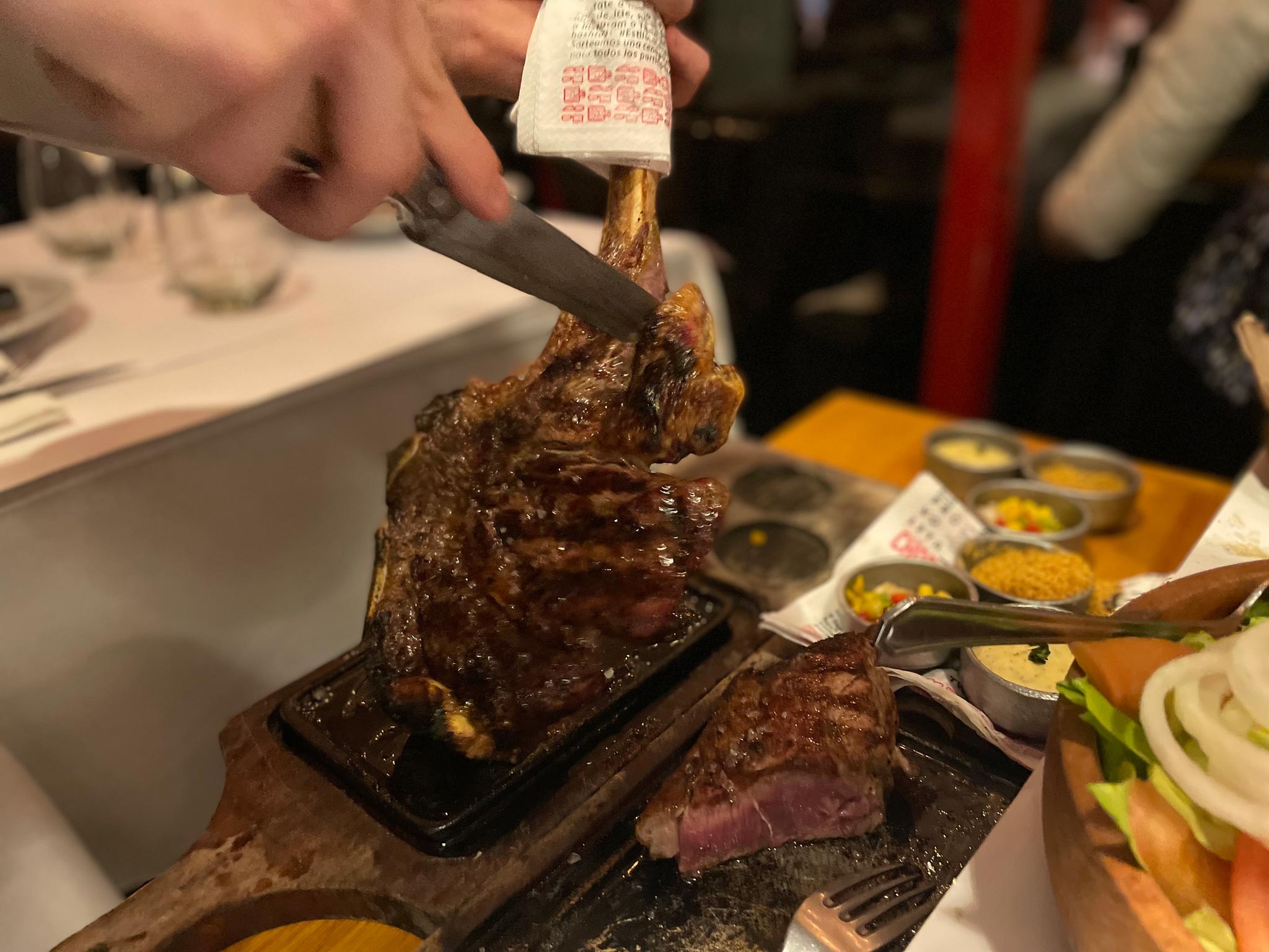 My giant axe of a steak arrives and holy moly, it’s so incredibly succulent and juicy and tasty. It’s pink in the middle and it has those beautiful nuggets of rendered fat in between the meat. I thought they would give us some chimichurri but this is plain with a bit of salt and some creamy sauce on the side. I’m not complaining. I thought I would struggle to finish this but it’s so appetising that I power through like a champ. Phoebe is having a harder time with hers and I don’t have the capacity to help her. We were even thinking of getting flan, there is absolutely no room for that. The salad is practically untouched. I’m also wasted off the Malbec.